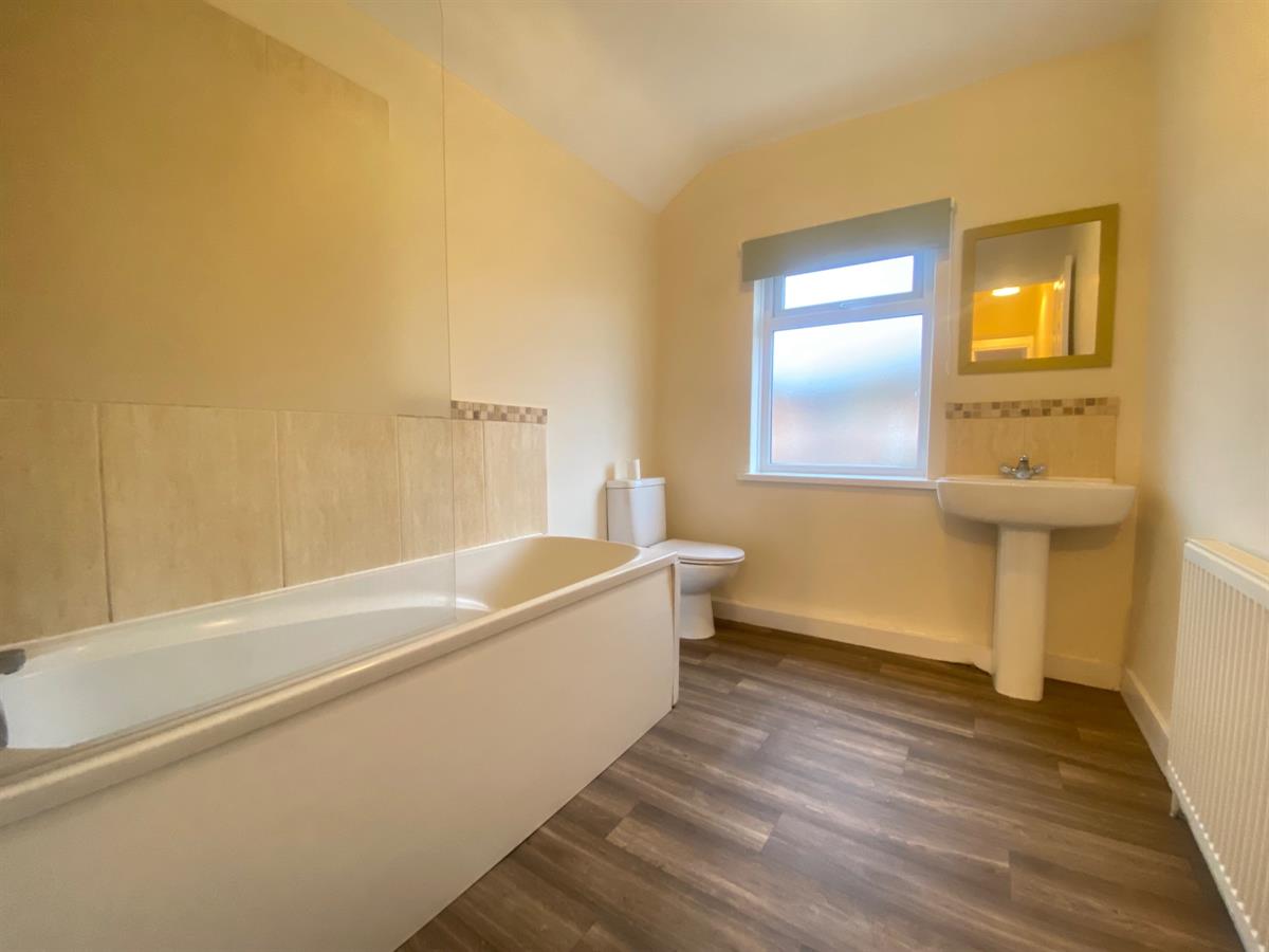 Spacious bathroom with independent access from both bedroom one and two. Having a uPvc double glazed frosted panelled window to the rear elevation, double panelled radiator. The bathroom is fitted with a three piece suite, comprising of a push button low level WC, pedestal wash hand basin with mixer tap and complimentary splash back tiling, panelled bath with glazed shower screen over housing a mixer tap / shower attachment, complimentary wall tiling, laminate flooring.