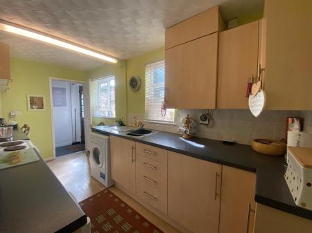 Fitted with a range of beech effect, wall, base and drawer units with worksurface over incorporating a one and half bowl stainless steel sink and drainer with mixer tap over, space for under counter fridge, space for under counter freezer, space for electric cooker, space and plumbing for washing machine. Wall mounted central heating boiler, housed in matching wall cupboard. Laminate flooring. uPvc double glazed windows to side elevation. Complimentary tiling. Radiator. Painted panelled door through to: