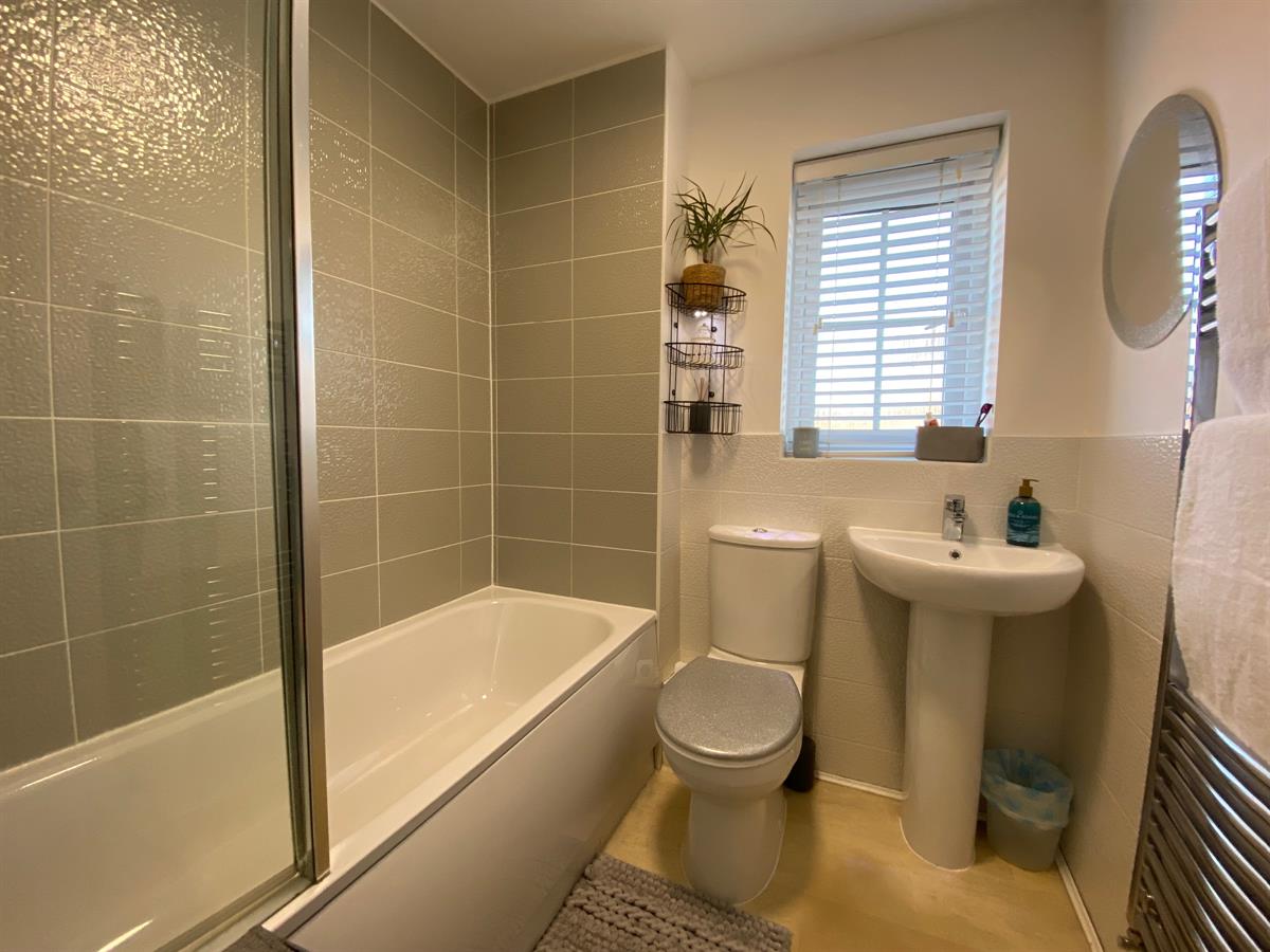Having a uPvc double glazed frosted panelled window to the front elevation, heated towel rail finished in chrome. The bathroom is fitted with a three piece suite comprising of a pedestal wash hand basin with mixer tap, push button low level WC, panelled bath with glazed shower screen over housing an electric shower, complimentary wall tiling.