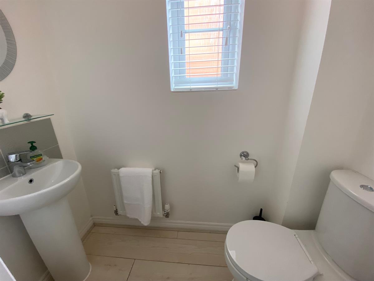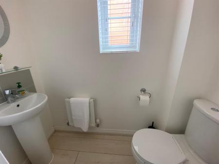 Having laminate flooring continued through from the reception hall, single radiator, fitted with a two piece suite comprising of a push button low level WC, pedestal wash hand basin with mixer tap and complimentary splash back tiling, uPvc double glazed frosted panelled window to the side elevation.