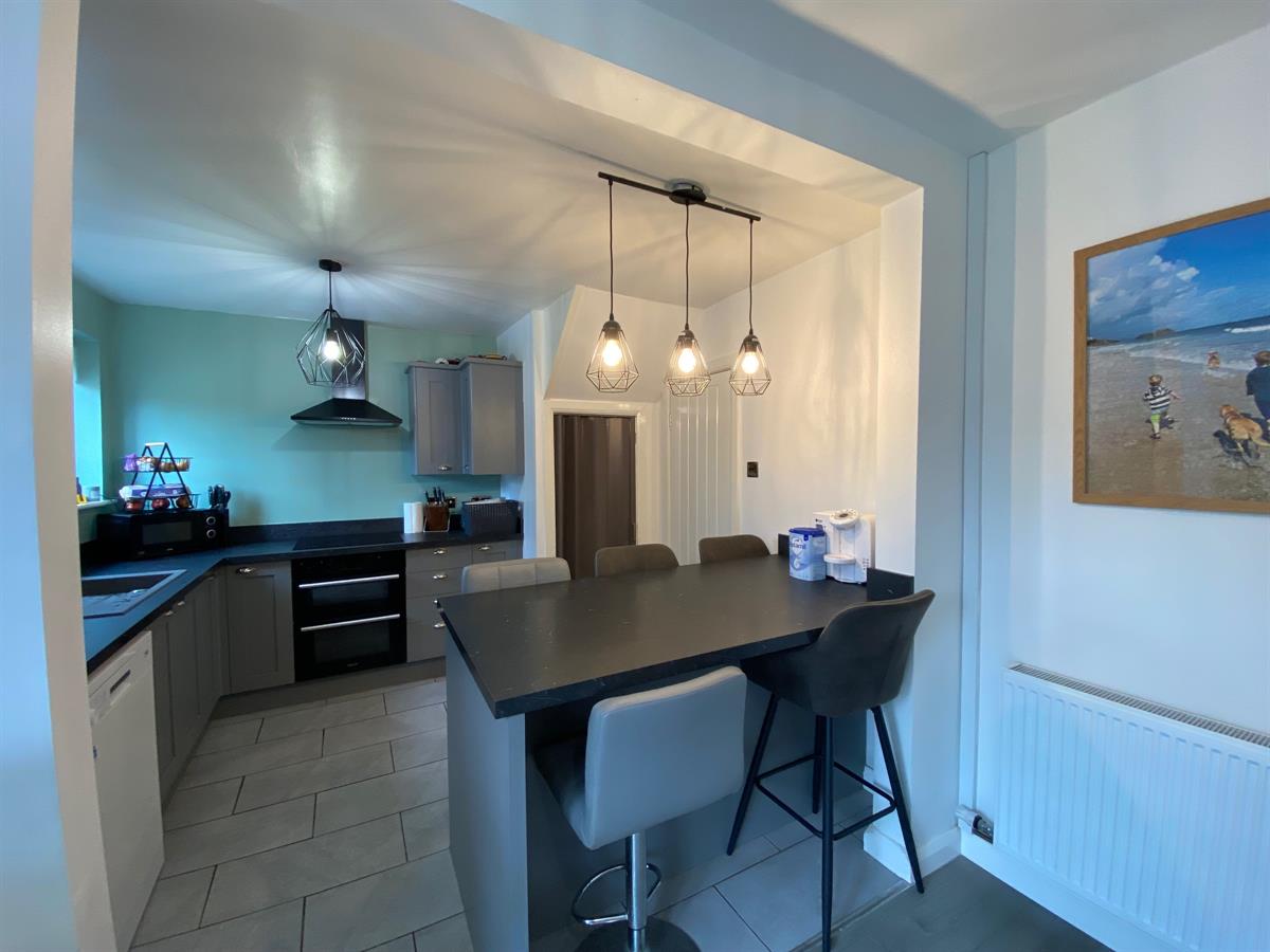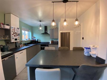 Modern fitted kitchen with a uPvc double glazed panelled window to the rear elevation, tiled flooring. The kitchen is fitted with a range of wall, base and drawer units with granite effect work surfaces over a single drainer resin sink unit with mixer tap, built in four ring electric induction hob with extractor hood over and electric double oven below, wall mounted central heating boiler, space for fridge, space for washer, built in breakfast bar.