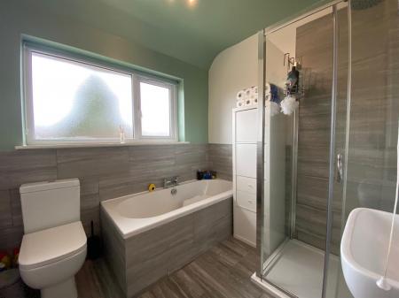 Modern family bathroom with a uPvc double glazed frosted panelled window to the rear elevation, double panelled radiator. The bathroom is fitted with a four piece suite comprising of a push button low level WC, double ended panelled bath with mixer tap, pedestal wash hand basin with mixer tap, walk in shower cubicle with glazed sliding doors housing a mixer shower with a rain fall shower head and additional hand held shower attachment over, tiled flooring, complimentary wall tiling.