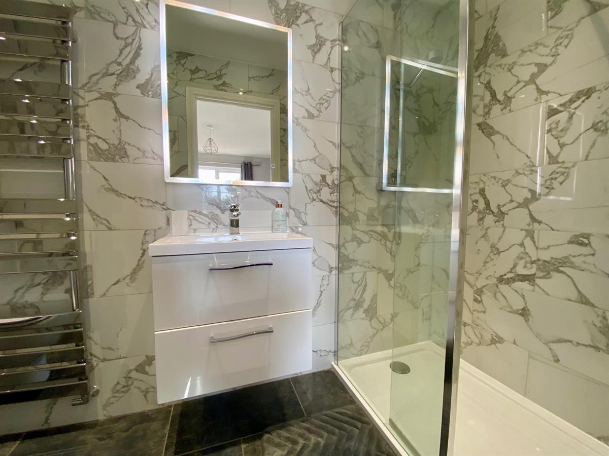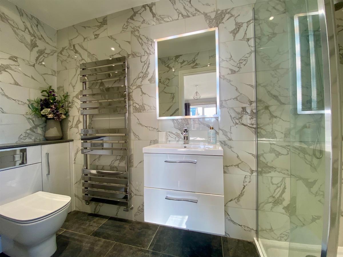 Beautifully appointed en-suite shower room with a three piece suite comprising of a push button low level WC with concealed cistern, vanity unit wash hand basin with mixer tap and storage drawers below and wall mounted vanity mirror with integrated lighting, walk in shower enclosure housing a mixer shower with rainfall shower head and additional hand held shower attachment, inset spot lighting, complimentary floor and wall tiling where visible, heated ladder style towel rail finished in chrome.