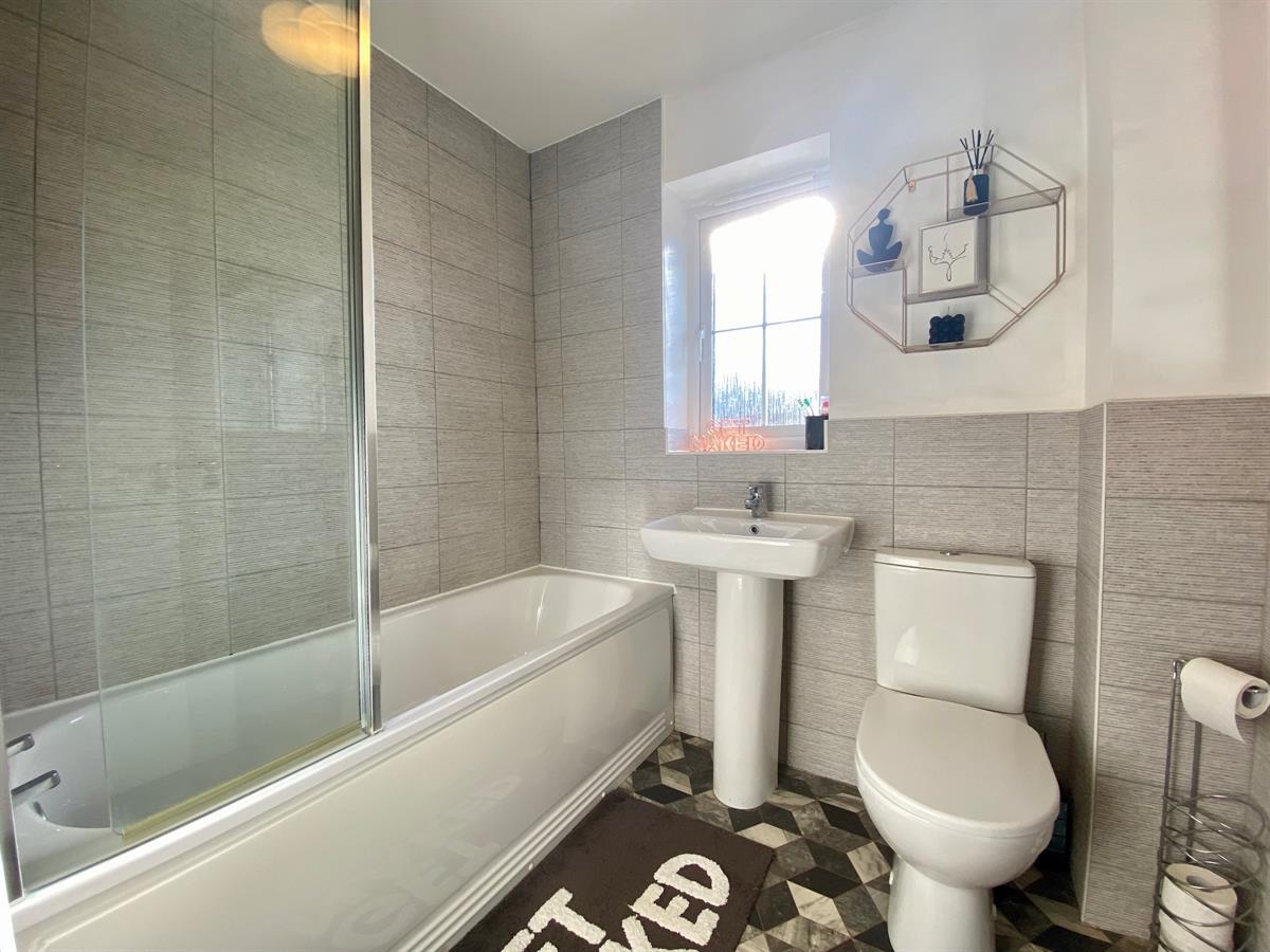 Good sized family bathroom with uPvc double glazed frosted panelled window to the front elevation, single panelled radiator, fitted with a three piece suite comprising of a push button low level WC, pedestal wash hand basin with mixer tap, panelled bath with glazed shower screen over, housing a mixer shower, complimentary wall tiling.