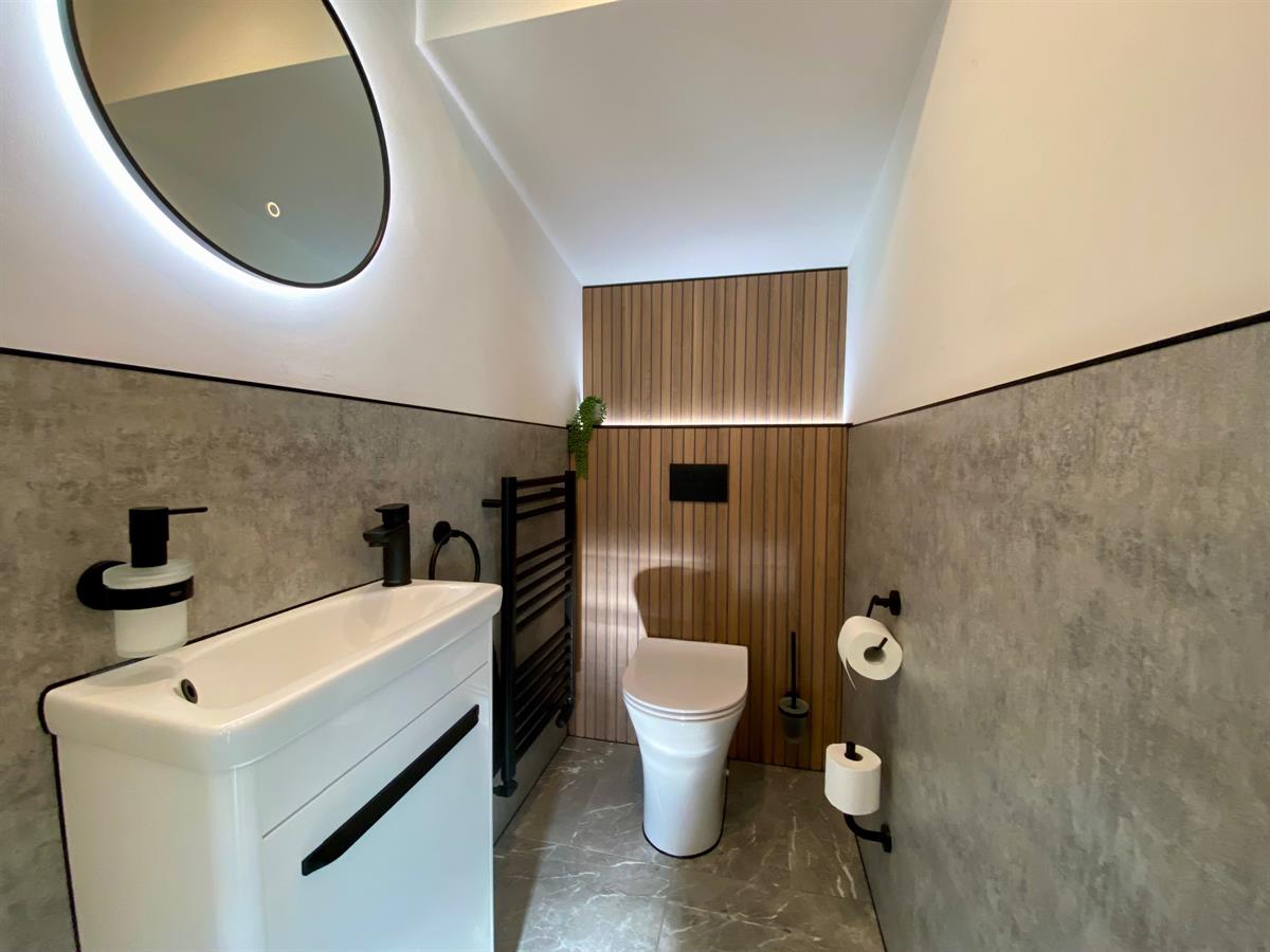 Beautifully appointed and upgraded ground floor cloakroom with a two piece suite comprising of a push button low level WC with concealed cistern and back lit lighting, vanity unit wash hand basin with mixer tap, complimentary wet boarding, heated towel rail, tile flooring.