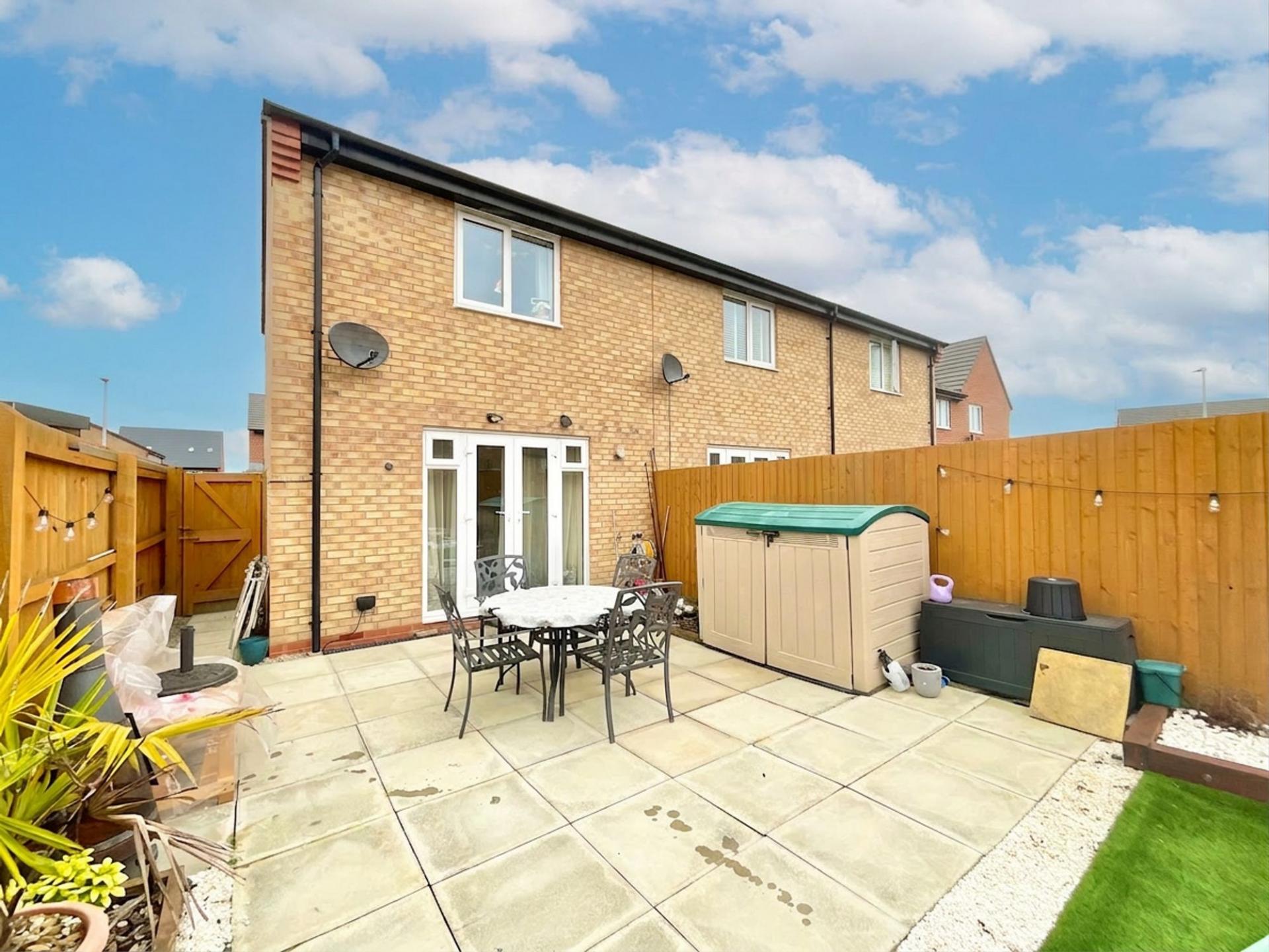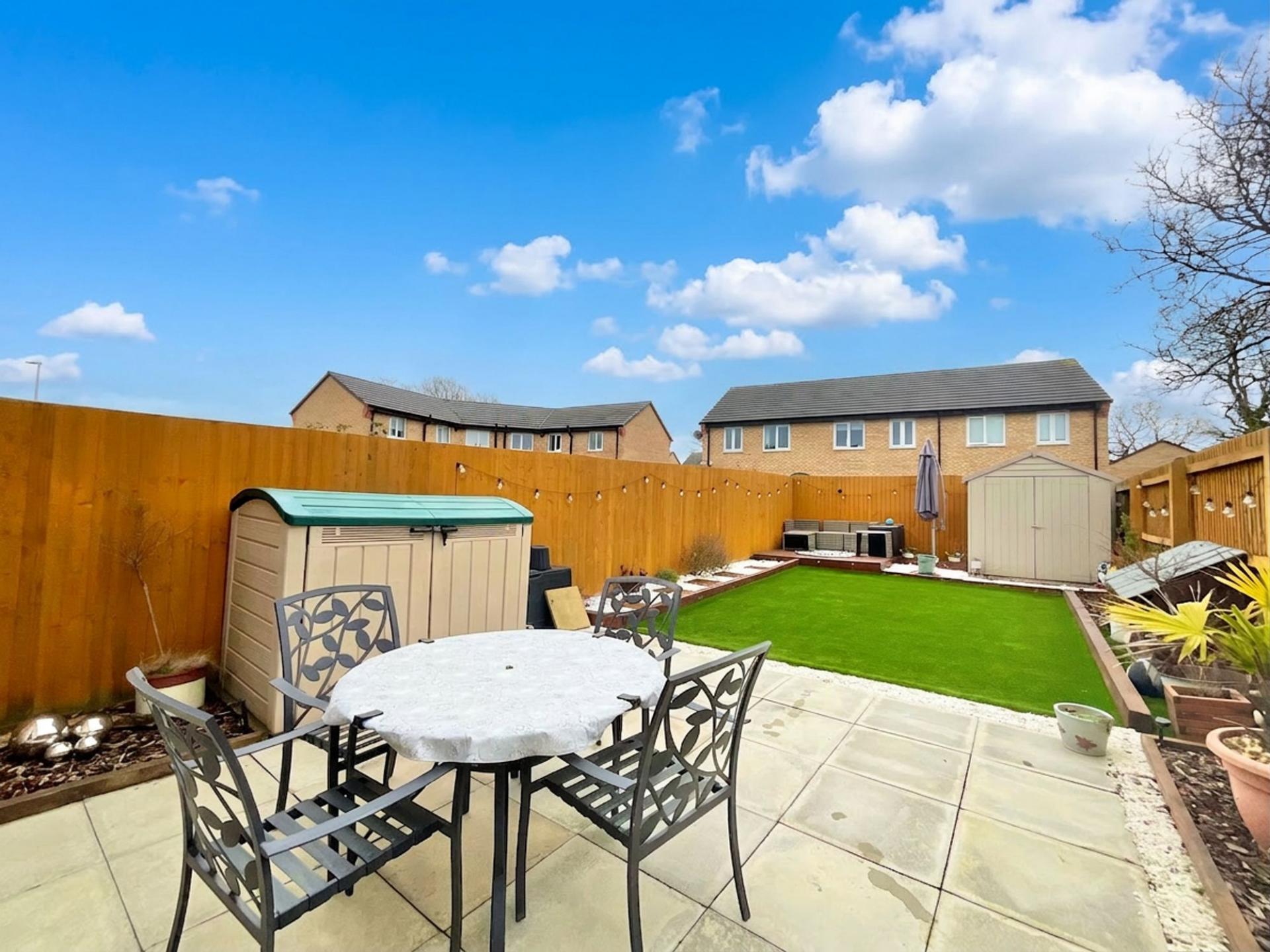 - Low-maintenance rear garden with patio, artificial lawn, raised decking area with sleeper borders and built-in lights, plus a shed for storage. Perfect for relaxing or entertaining.
