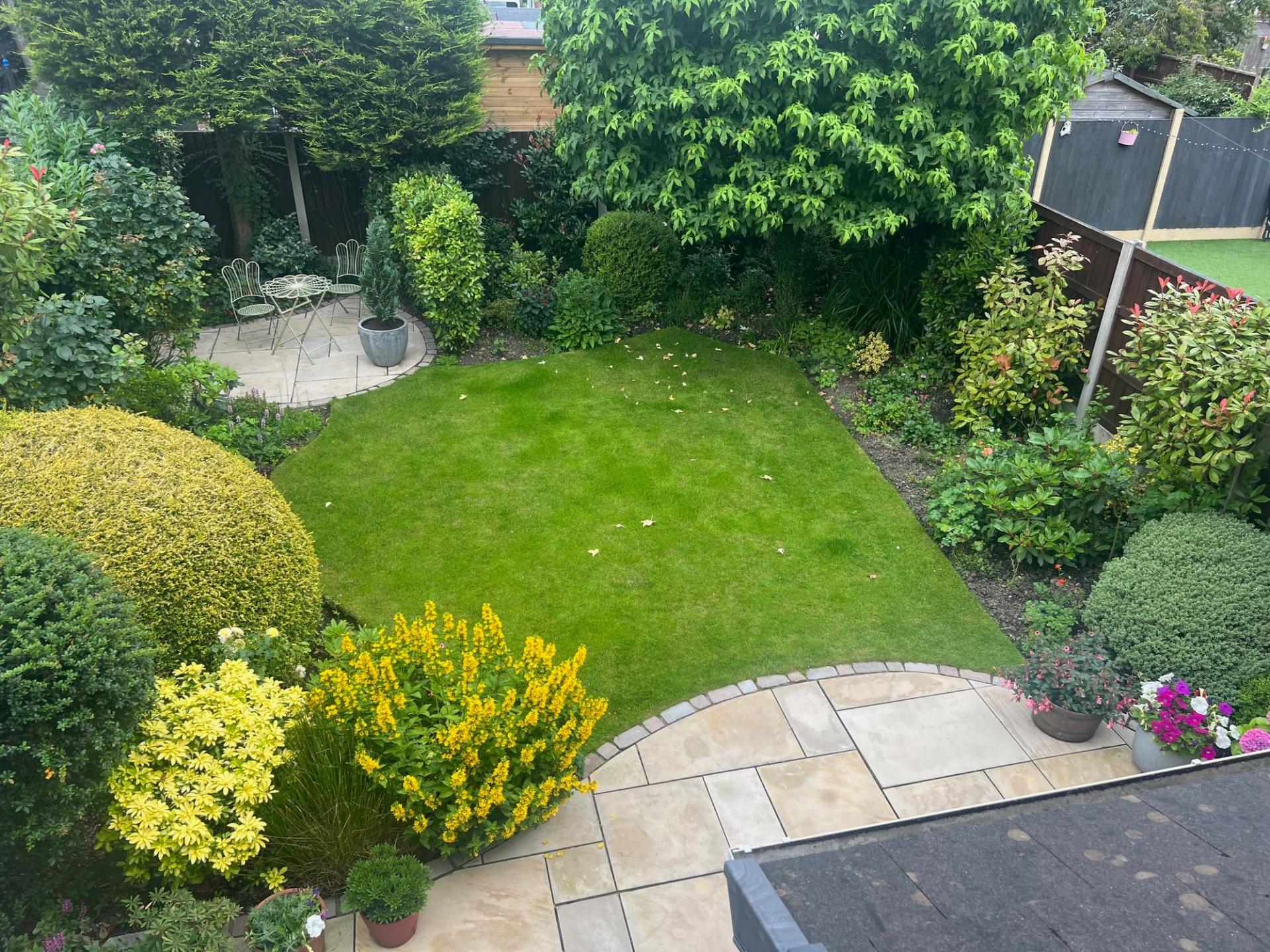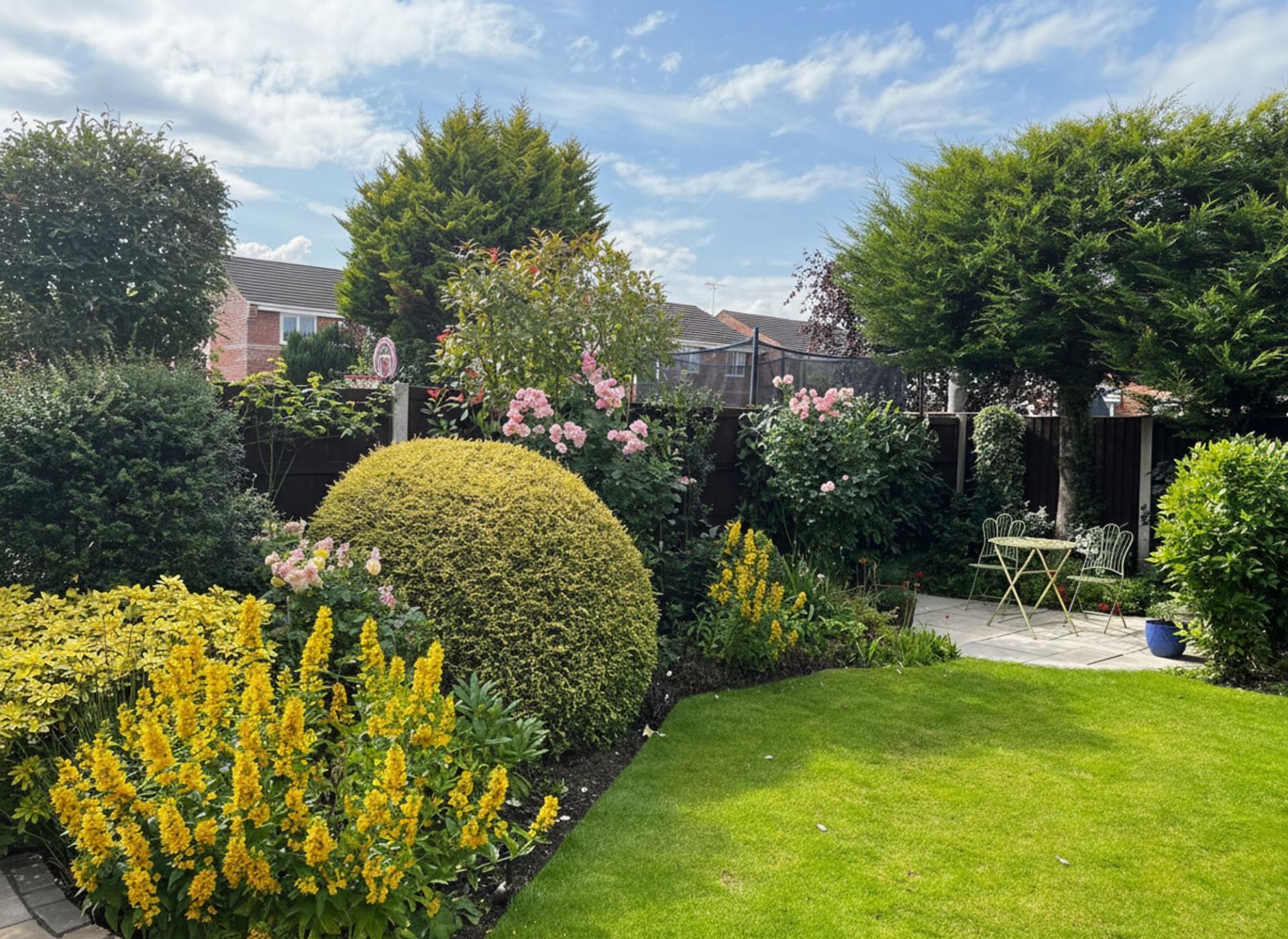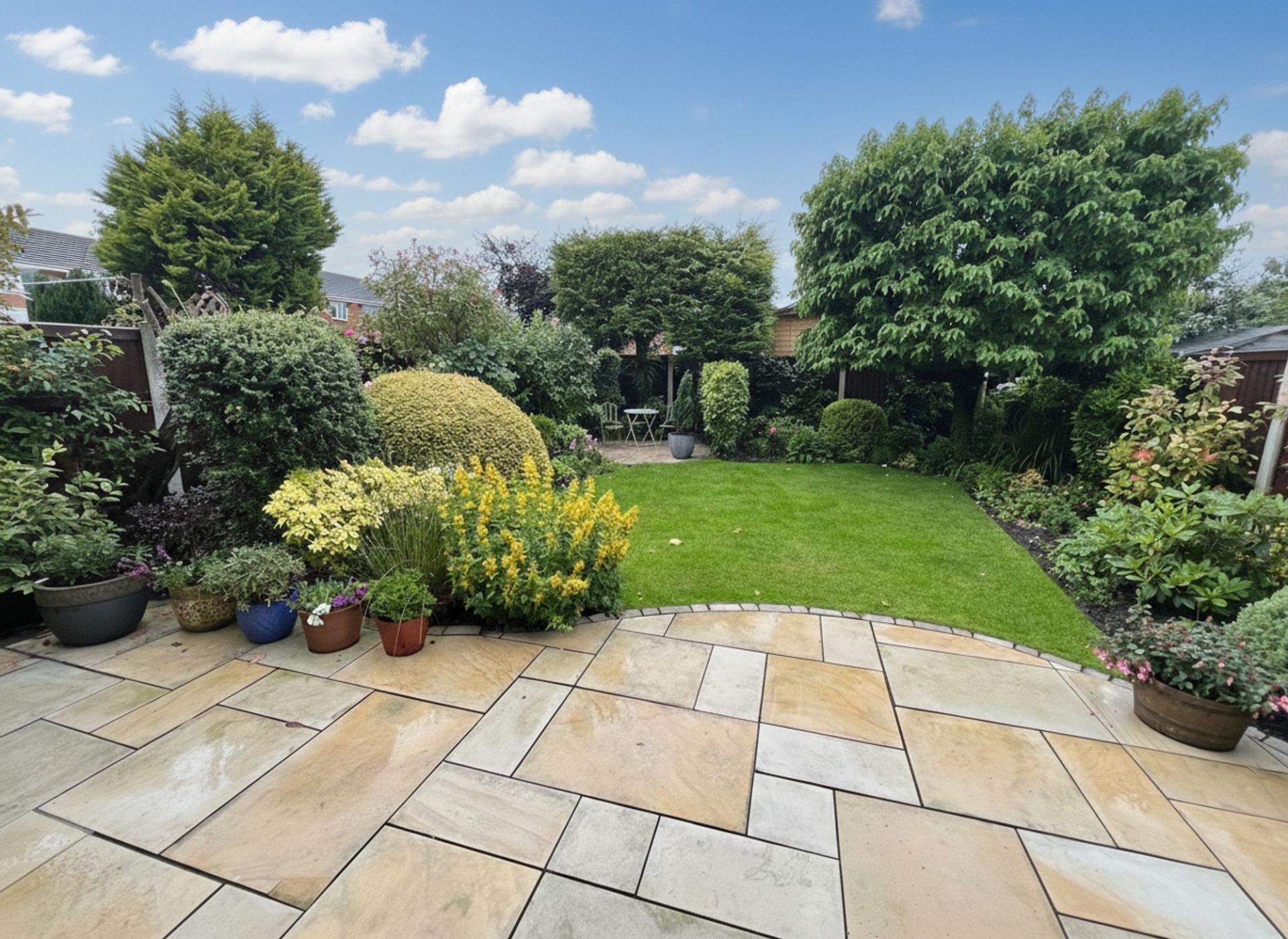 - Landscaped rear garden with patio, lawn, and mature trees and shrubs for privacy