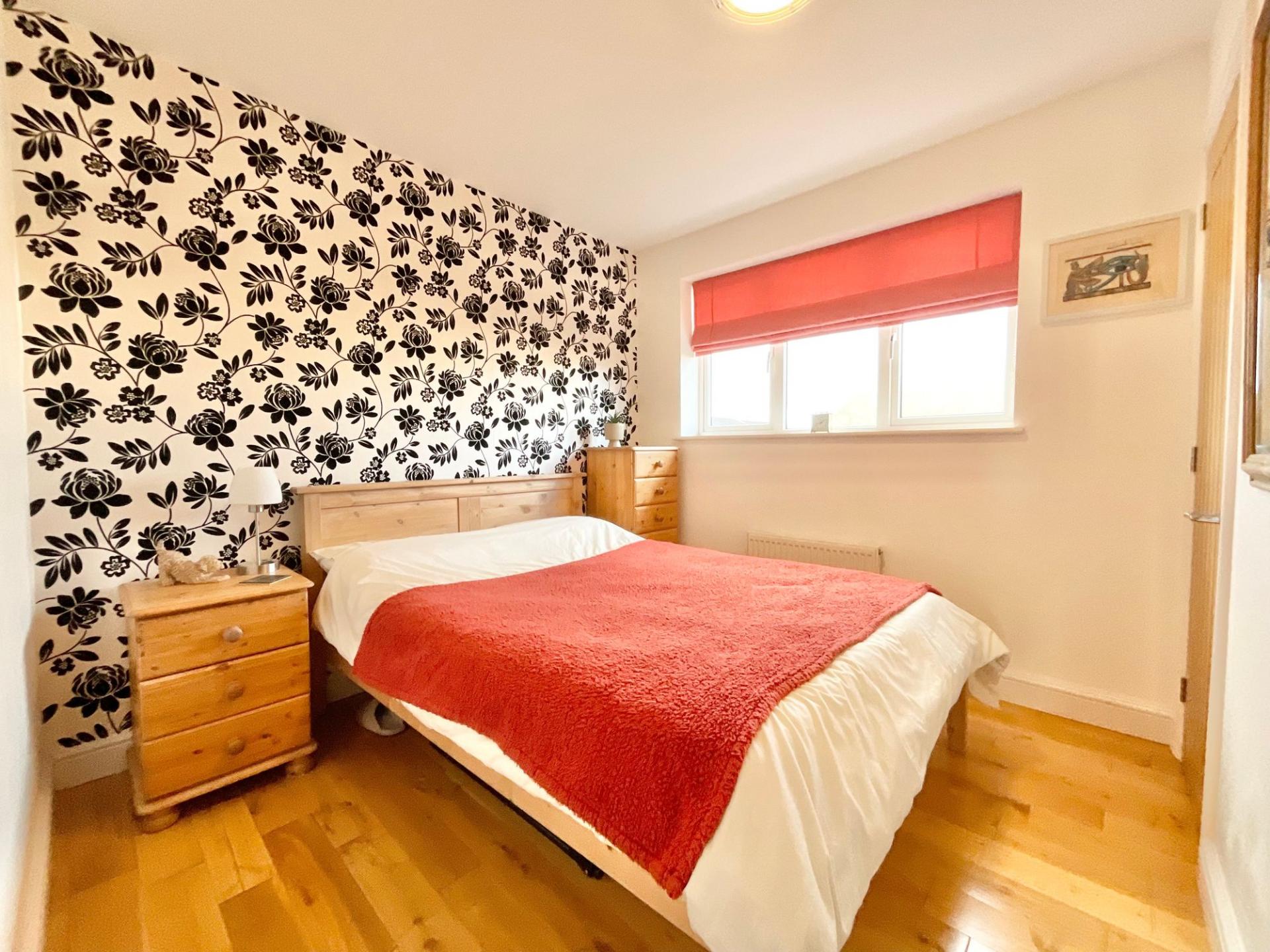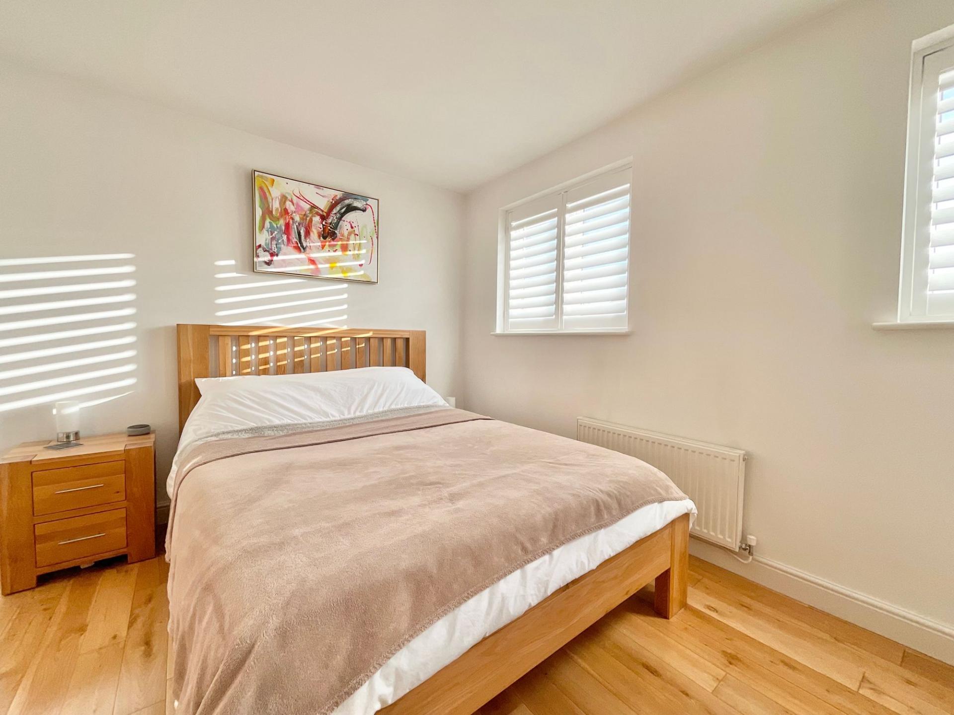 - Spacious master bedroom featuring plantation shutters, dual windows, fitted wardrobes & new en-suite