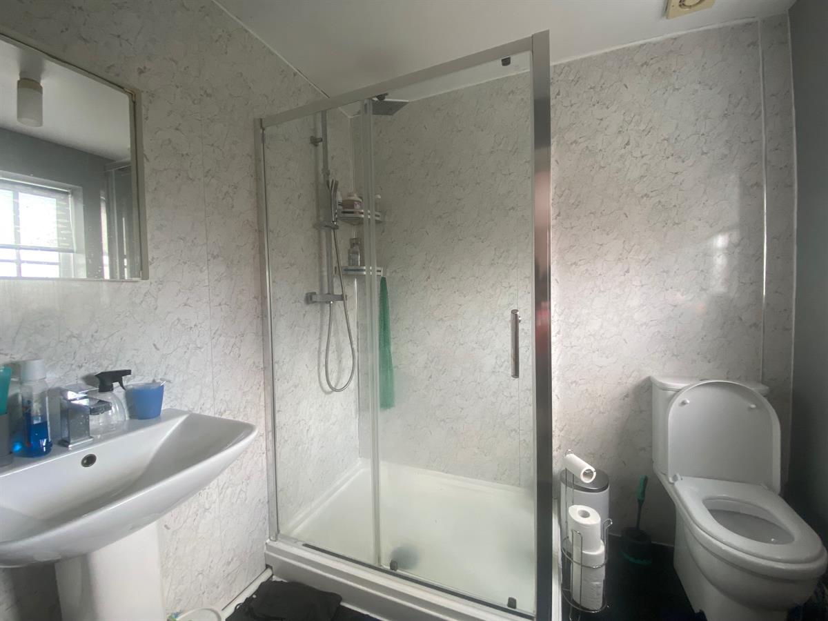 Having a three piece suite comprising of a pedestal wash hand basin with mixer tap, push button low level WC, walk in shower cubicle with glazed sliding doors housing a mixer shower with a rain fall shower head and additional hand held shower attachment, heated towel rail finished in chrome, uPvc double glazed frosted panelled window to the front elevation.