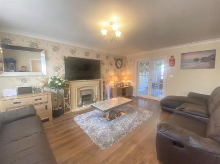 Spacious lounge with uPvc double glazed panelled deep sill bay window to the front elevation, double panelled radiator, feature marble fire place housing a electric fire, glazed panelled double doors leading into the dining kitchen.