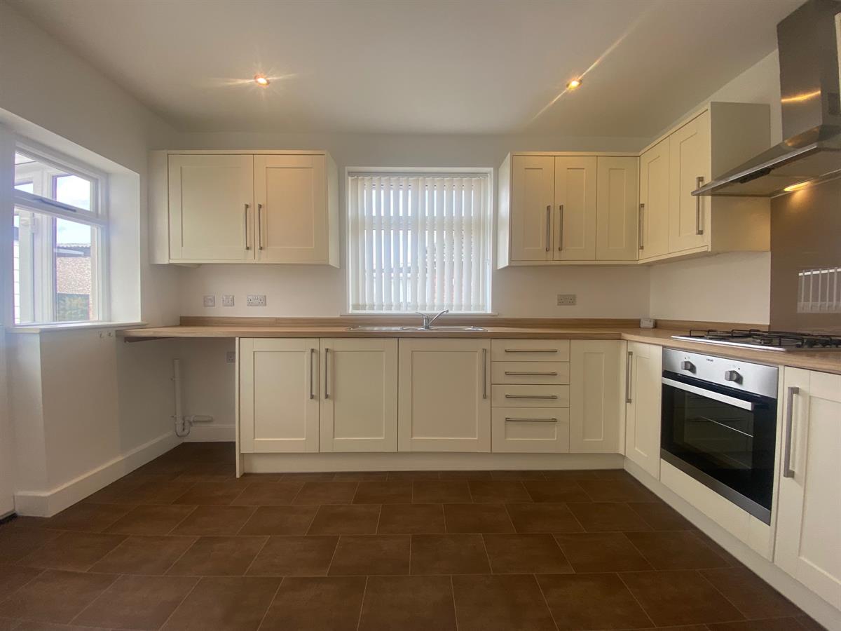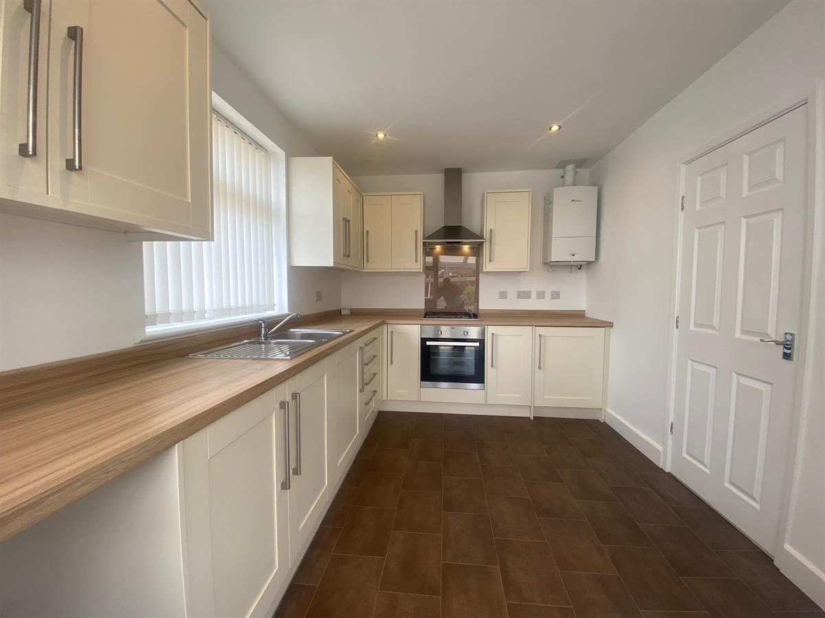 The kitchen is fitted with a range of wall base, and drawer units with work surfaces over incorporating a one and a half bowl stainless steel single drainer sink unit with mixer tap, built in four ring gas hob with extractor hood over and electric oven below, integrated fridge, wall mounted central heating boiler, double panelled radiator, inset spot lighting, space for washer, tiled flooring, uPvc double glazed panelled window to the side elevation, single glazed panelled door leading into the conservatory.
