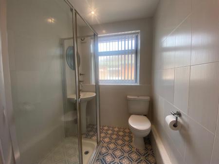 Modern shower room with a uPvc double glazed frosted panelled window to the side elevation. Fitted with a three piece suite comprising of a push button low level WC, pedestal wash hand basin with mixer tap, walk in shower cubicle with glazed sliding door housing a mixer shower, heated towel rail finished in chrome, built in storage cupboard, inset spot lighting.
