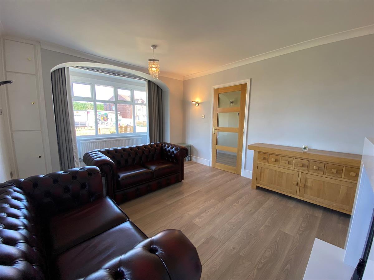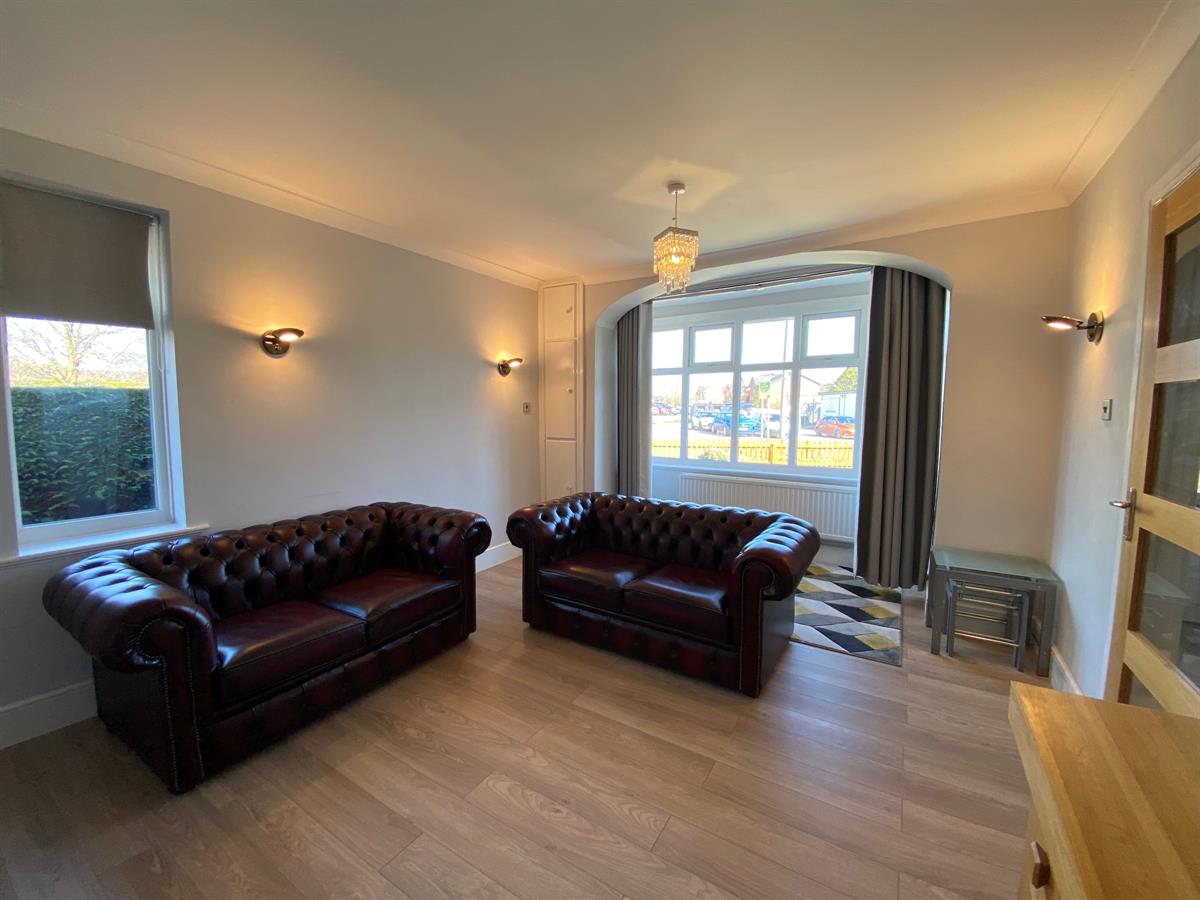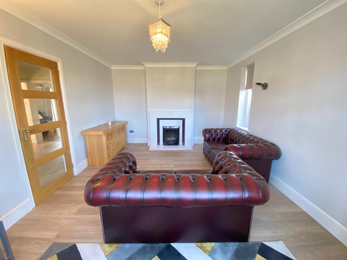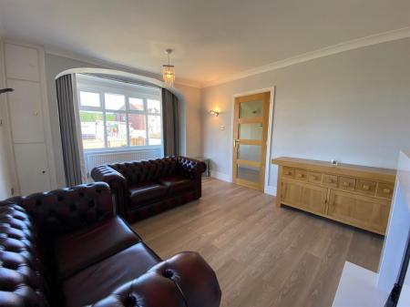 Spacious sitting room with a uPvc double glazed panelled walk in bay window to the front elevation, double panelled radiators, laminate flooring, uPvc double glazed panelled window to the side elevation, 3 wall light points, marble fire surround housing a log effect gas fire.