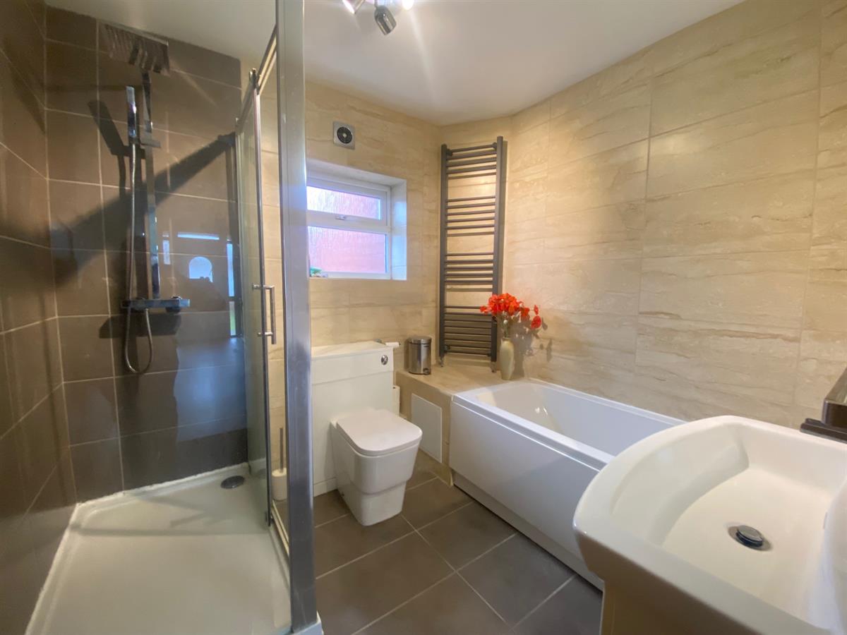 Modern ground floor bathroom with a uPvc double glazed frosted panelled window to the rear elevation, heated ladder style towel rail. The bathroom is fitted with a four piece suite comprising of a pedestal wash hand basin with mixer tap and storage cupboard below, push button low level WC with concealed cistern, panelled bath with mixer tap / shower attachment over, walk in shower cubicle with glazed sliding doors housing a mixer shower with a rain fall shower head and additional hand held shower attachment, complimentary tiling to the walls where visible, tiled flooring.