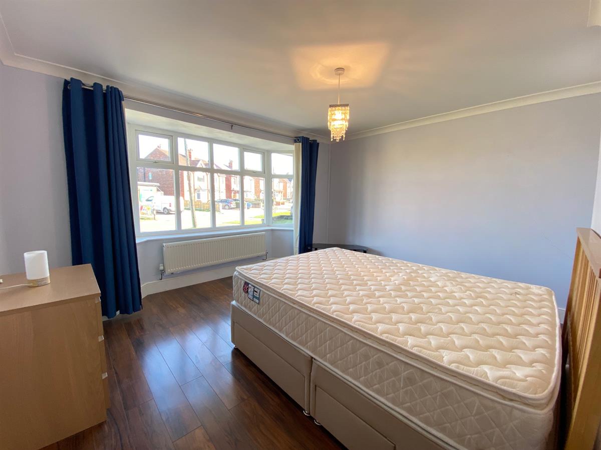 Large double room with uPvc double glazed walk in bay window to the front elevation, double panelled radiator, laminate flooring, two wall light points.