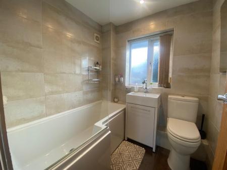 Fitted with a 3 piece suite comprising: P shaped panelled bath with rainfall shower over and glazed shower screen, vanity unit with oval wash hand basin with mixer tap over and cupboard below, low level, push button wc. uPvc modesty glazed window to rear elevation. Tiled walls and floor. Chrome heated ladder towel rail. Inset spotlighting. Extractor fan.