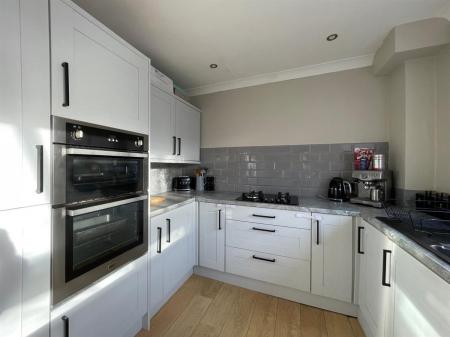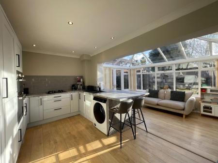 Fitted with a range of hand painted, wall, base and drawer units with work top over incorporating a black resin, single drainer sink with mixer tap over and fitted double oven, four ring gas burner hob. Complimentary tiling, under counter fridge, under counter freezer, space and plumbing for washing machine. Inset spot lights. Part tiled walls. Breakfast bar. Engineered wood flooring and open into the Conservatory.