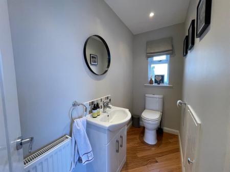 Fitted with a 2 piece suite comprising: vanity unit wash hand basin with mixer tap over and cupboard below with tiled splashback, low level push button wc. Storage for electric meters. Inset motion sensor spot lighting. Radiator, Karndean flooring continued through from the reception hall, uPvc modesty glazed window to rear elevation.