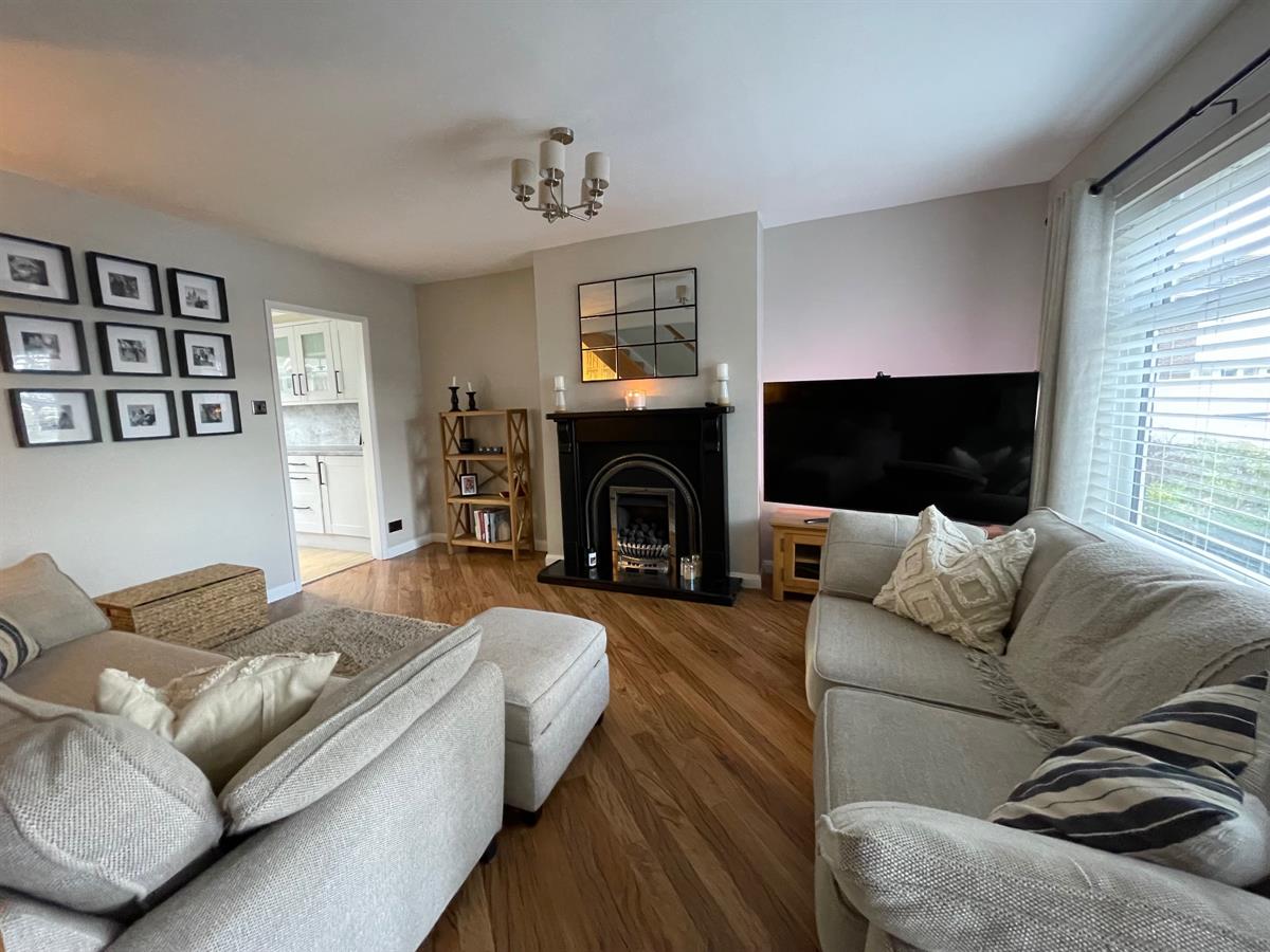 Spacious living room with feature fireplace with feature gas coal effect fire having painted wooden mantel surround and tiled hearth. Karndean flooring continued through from the reception hall. uPvc double glazed window to front elevation. Radiator. Light Oak and glass banister staircase to first floor. Part glazed wooden door through to kitchen/conservatory
