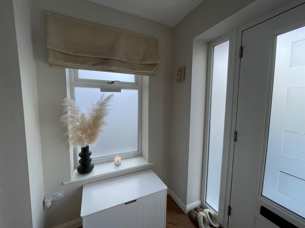 Having feature, wall mounted modern chrome radiator, uPvc modesty glazed window to side elevation, painted panelled doors to coat cupboard and cloakroom. Karndean flooring, radiator. Motion sensor inset spotlights. Part glazed, painted panelled door leads into the sitting room.