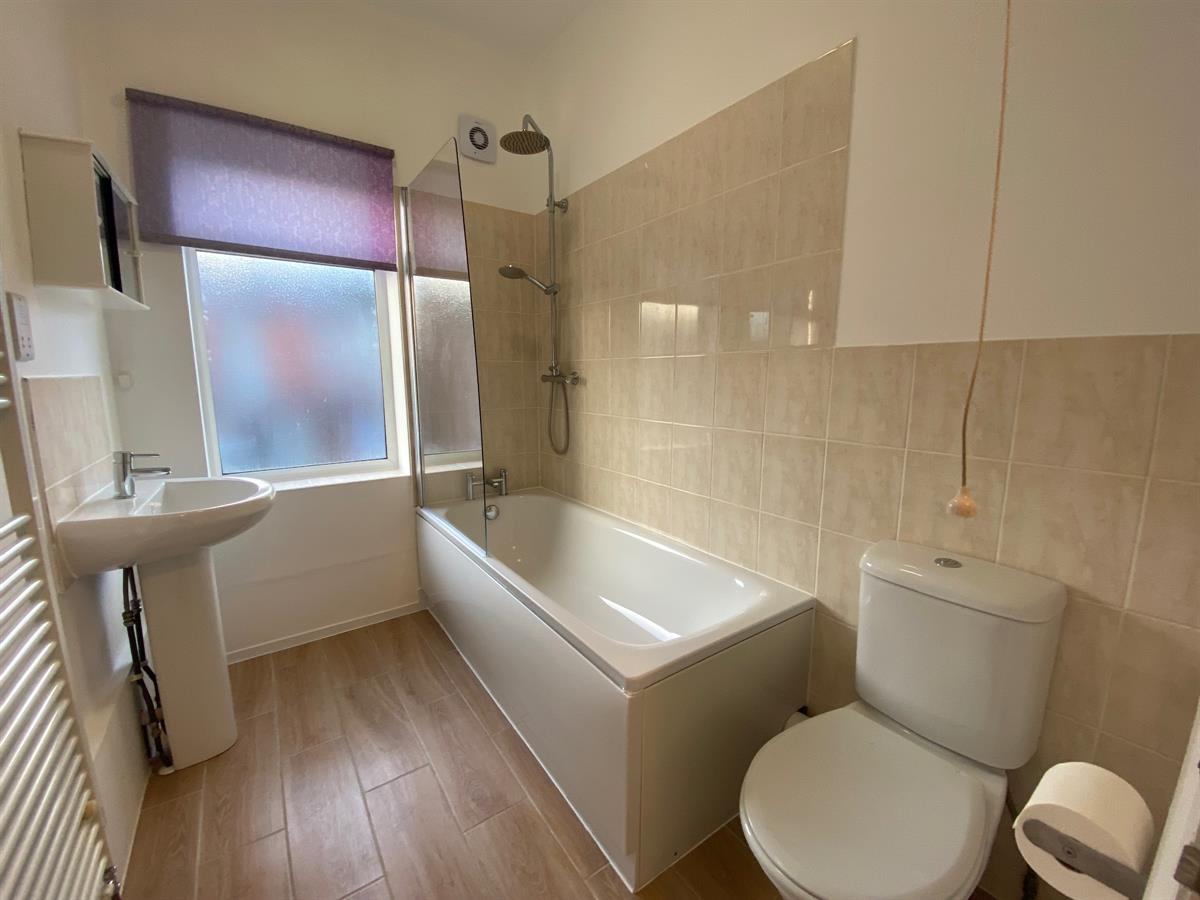 Fitted with a 3 piece suite comprising panelled bath with shower having rainfall and hand held shower and mixer tap over, glazed pivot shower screen, low level push button W.C., pedestal wash hand basin with mixer tap and tiled splashback, ladder towel rail and modesty glazed uPvc window to front elevation.