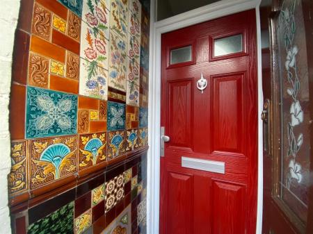 Having delightful, original Minton tiling to floor and walls, plaster coving to ceiling and leading to part modesty glazed, composite door opening into:
