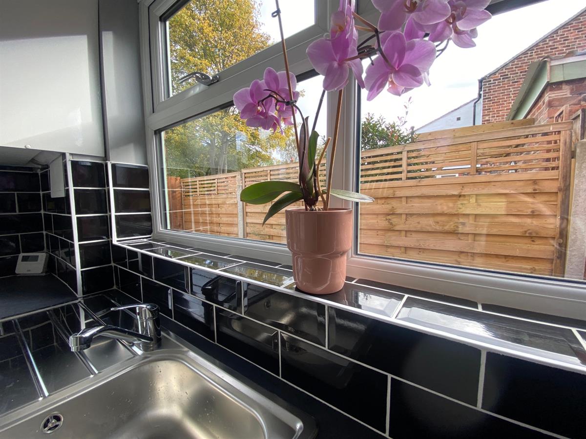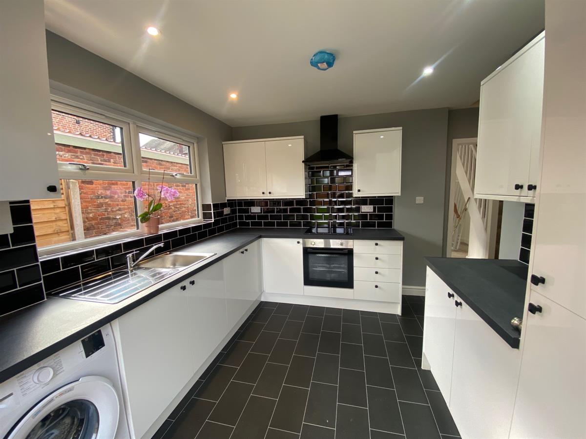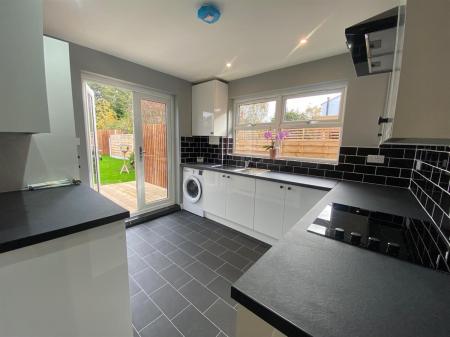 Fitted with a range of high gloss, soft close wall, base and drawer units with work surface over incorporating a single bowl, stainless steel sink and drainer with mixer tap, integrated electric oven with ceramic hob and extractor over. Wall mounted central heating boiler housed in matching cupboard, space and plumbing for washing machine, integrated fridge/freezer. uPvc double glazed windows to side elevation, uPvc double glazed French doors to rear elevation. Complimentary tiling, inset spotlighting and wired smoke alarm. Laminate flooring.