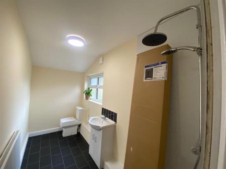 Having walk in shower cubicle with rainfall and hand held shower attachments, vanity unit wash hand basin with tiled splashback, mixer tap over and cupboards below, low level, push button W.C. extractor fan, modesty glazed, sash effect window to side elevation. Laminate flooring.