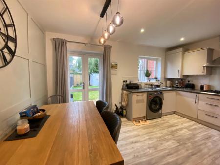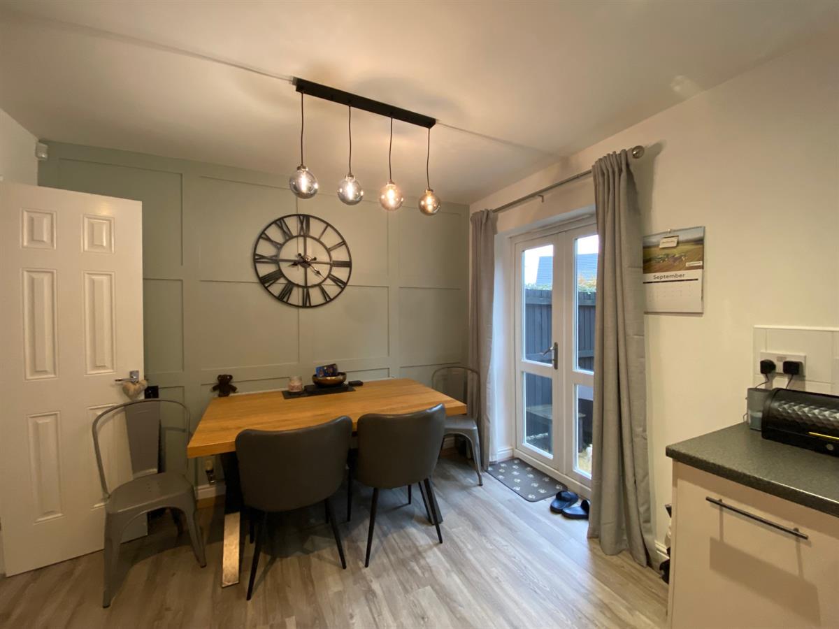 Really spacious dining kitchen with ample space to enjoy family meals together. The kitchen area is fitted with a range of wall, base and drawer units with granite effect roll top work surfaces over, incorporating a one and a half bowl stainless steel single drainer sink unit with mixer tap and complimentary splash back tiling, built in four ring ring gas hob with extractor hood over and built in eye level electric oven to the side, space for American style fridge freezer, space and plumbing for washer, built in dishwasher, wall mounted central heating boiler concealed with the kitchen unit, uPvc double glazed panelled window to the rear elevation. To the dining area there is space for dining table and chairs, double panelled radiator, feature panelled wall, uPvc double glazed panelled doors leading out to the rear garden, inset spot lighting throughout.