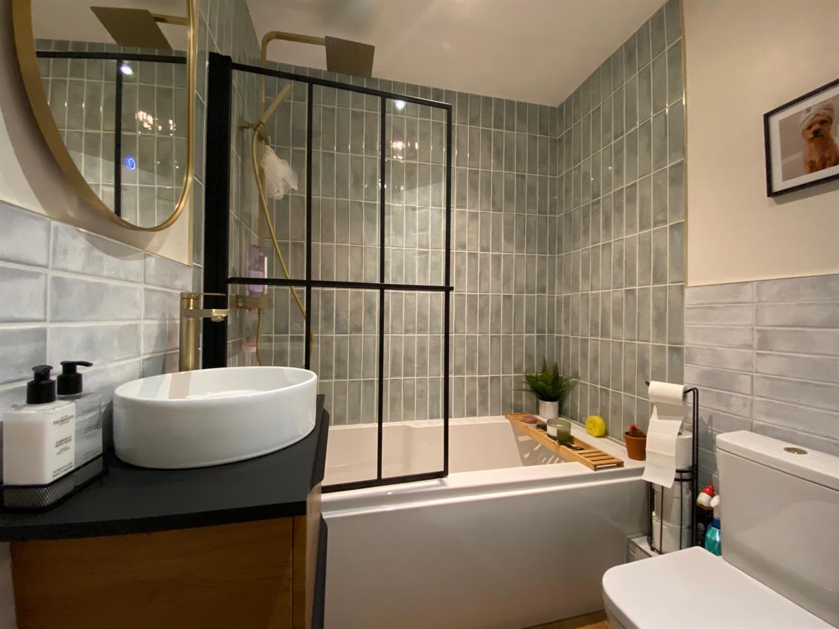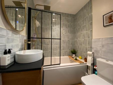 Recently renovated family bathroom comprising of a push button low level WC, vanity unit wash hand basin with mixer tap and storage drawers below, panelled bath with glazed shower screen over housing a mixer tap and mixer shower with a hand held shower attachment and rain fall shower head, complimentary tiling, wall mounted shaver socket, inset spotlighting , heated towel rail.