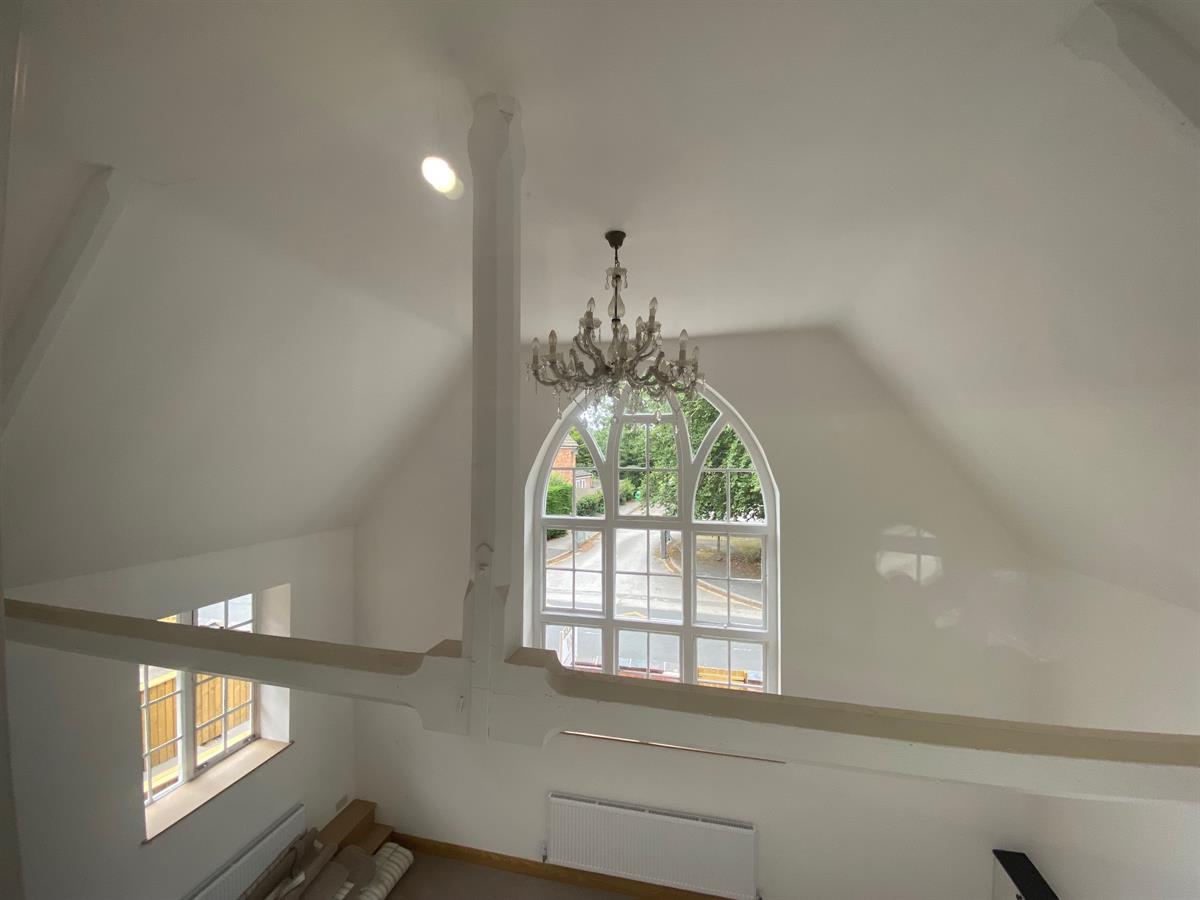 Vast sitting room with high vaulted ceiling exposing original supporting beams, original feature windows to both front and side elevations which flood the room with daylight, 2 radiators and cupboard housing the meters.,