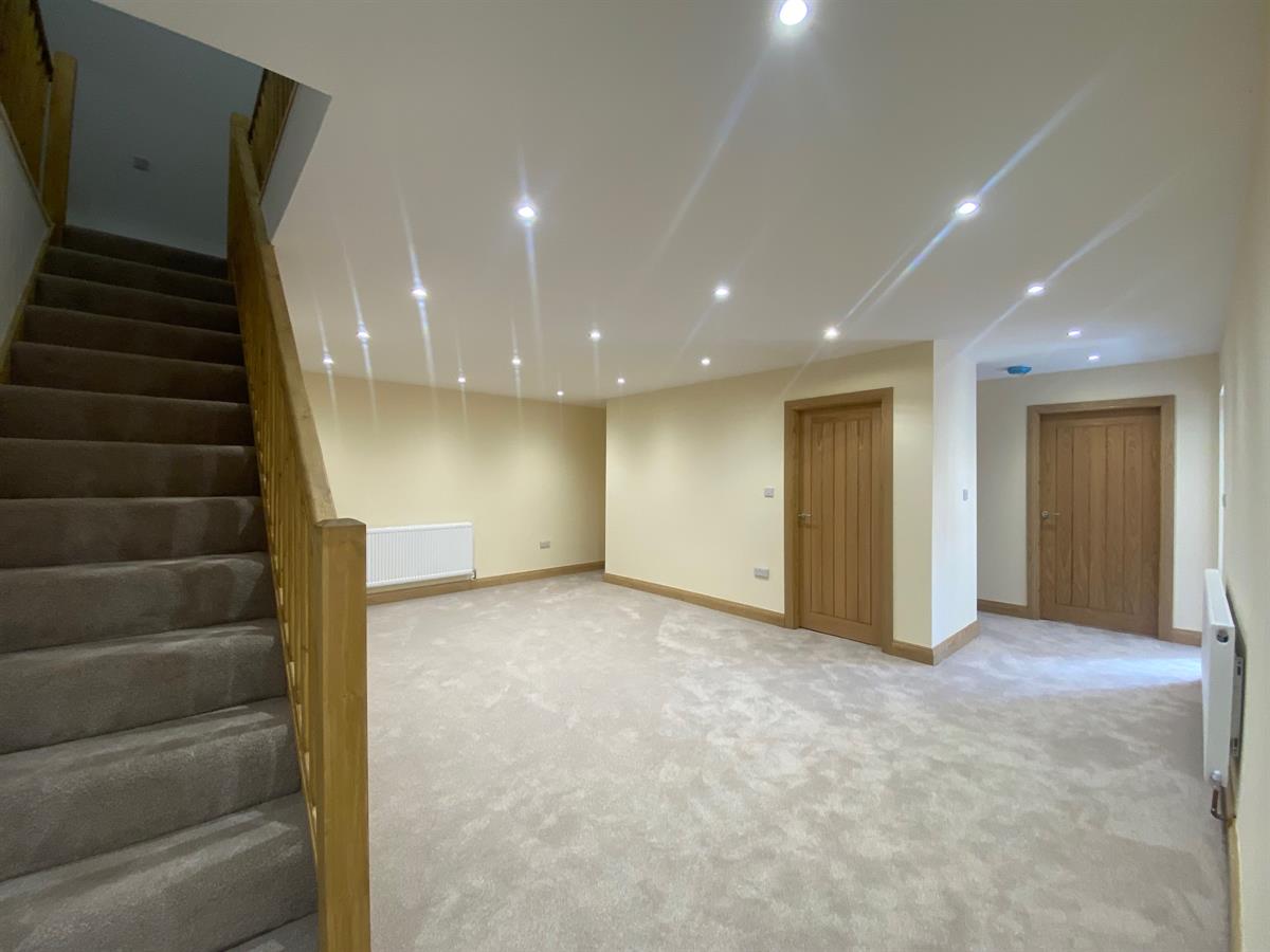 Spacious hallway having inset spotlighting, radiator, wired smoke alarm doors off to family bathroom, dining kitchen, storage cupboard and sitting room.