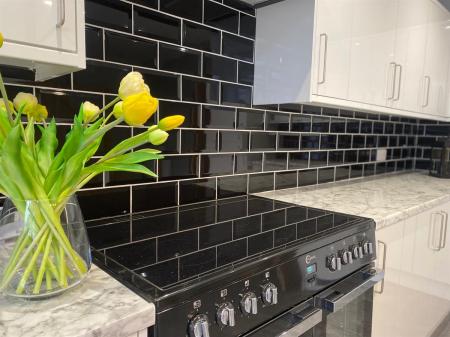 A generously proportioned family kitchen with staircase off leading to the first floor and fitted with a range of high gloss wall, base and drawer units with granite effect work surface over incorporating a one and a half bowl stainless steel sink and drainer with mixer tap, integrated fridge/freezer, space and plumbing for washing machine which is included, space for range oven which is included with extractor hood over, complimentary tiling, inset spotlighting, wired smoke alarm, understairs storage cupboard, window to rear elevation. Archway through to: