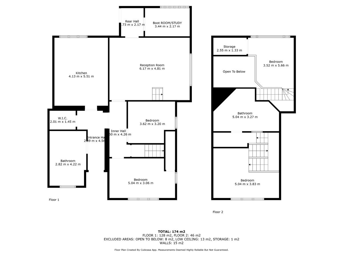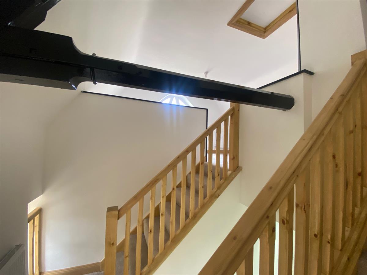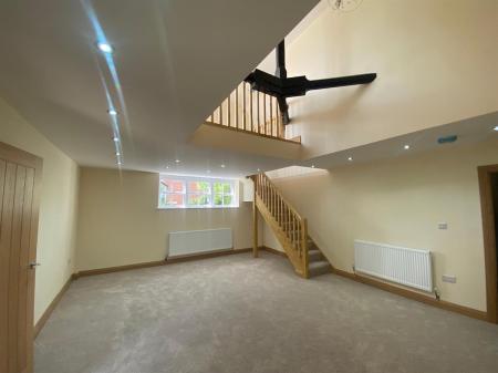 Staircase rising to first floor landing with mezzanine level as described previously but benefitting from an additional storage room. a further staircase from the rear hall leads to a landing with radiator and also to: