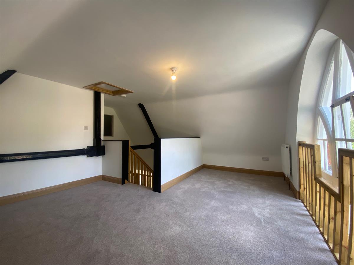 Master bedroom of generous proportions with radiators and window to rear elevation. Exposed trusses and loft access.