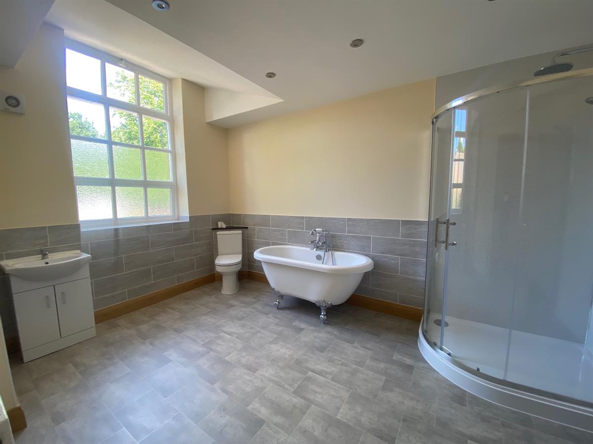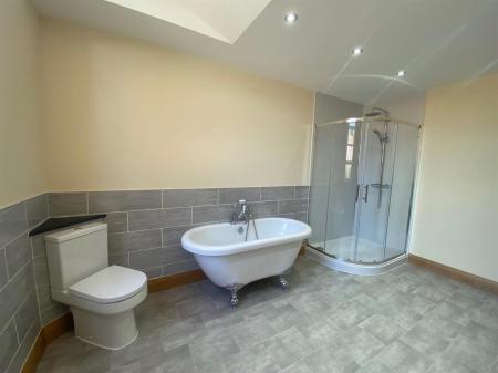 Large bathroom with roll top bath with claw feet, concealed cistern, low level, push button W.C., vanity unit wash hand basin with mixer tap over and storage cupboard below. Walk in shower cubicle with rainfall and hand held shower. Laminate flooring. Window to front elevation. Radiator. Inset spotlighting.