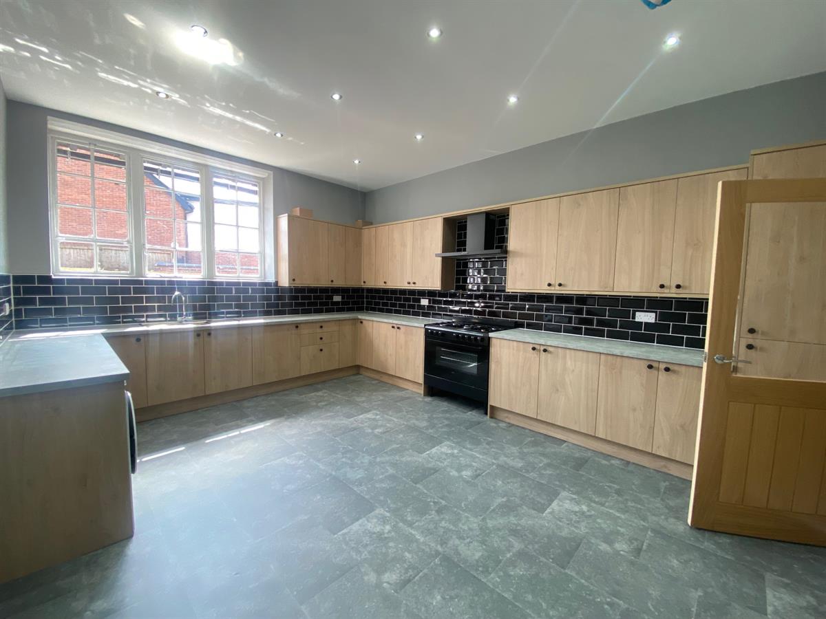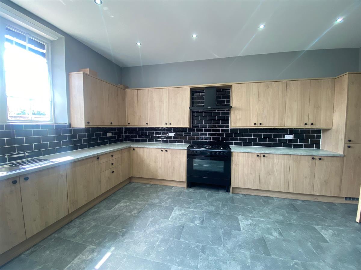 Spacious dining kitchen fitted with a range of beech effect wall, base and drawer units with work surface over incorporating a one and a half bowl stainless steel sink and drainer with mixer tap, complimentary splashback tiling, space for range cooker which is included, space and plumbing for washing machine which is included, integrated fridge/freezer. Wall mounted central heating boiler in kitchen cupboard, inset spotlighting and laminate flooring. Ample room for dining table and chairs. Radiator and window to rear elevation.
