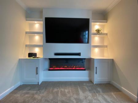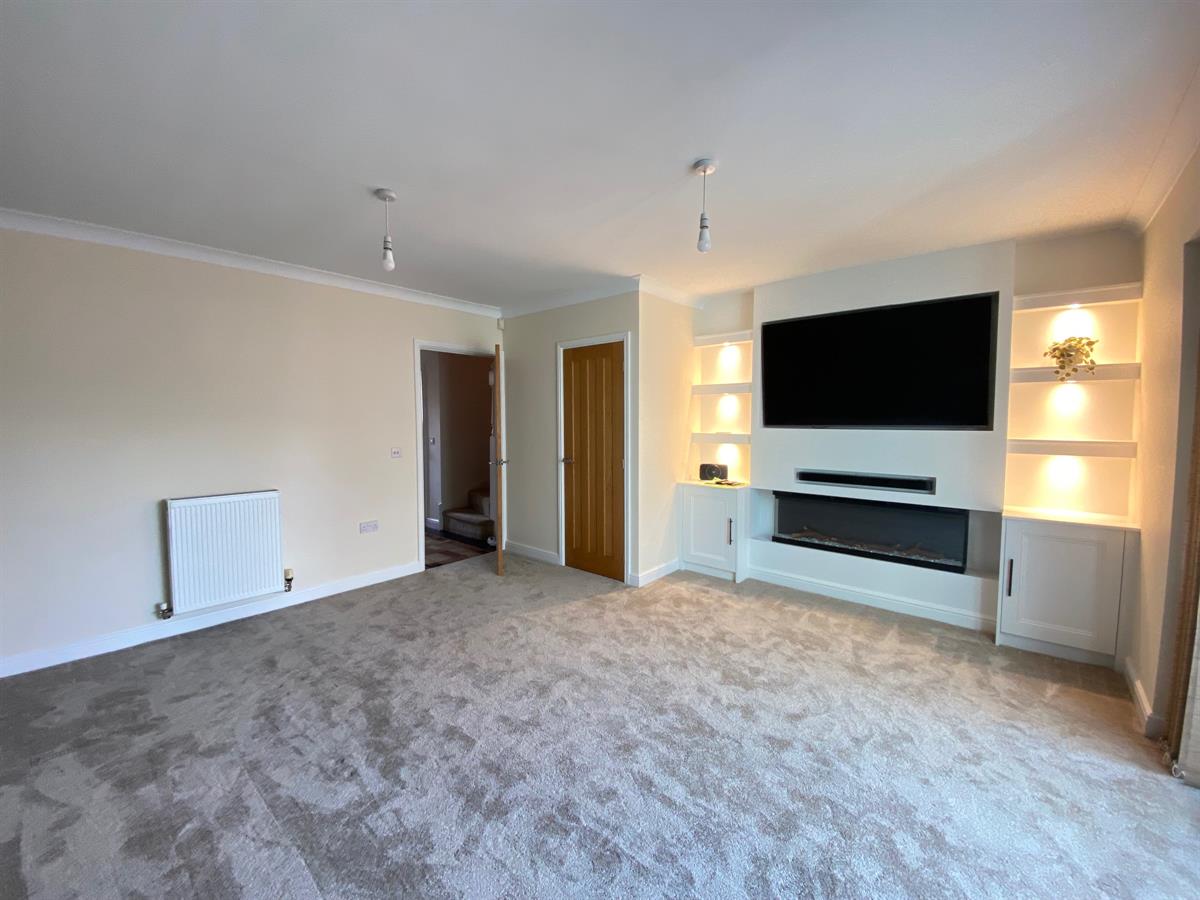 Really spacious living room with double panelled radiator, uPvc double glazed French doors leading into the conservatory, door into the under stair storage cupboard, feature media wall with integrated display shelving and inset spot lights housing a contemporary multi coloured media wall electric fire, two built in storage cupboards.