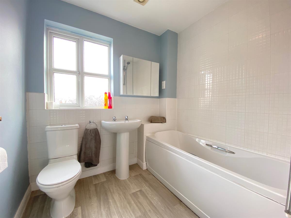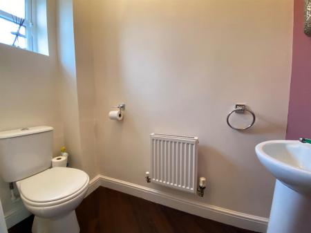 Having a double panelled radiator, Amtico flooring, uPvc double glazed frosted panelled window to the front elevation, two piece suite comprising of a push button low level WC, pedestal wash hand basin with complimentary splash back tiling.