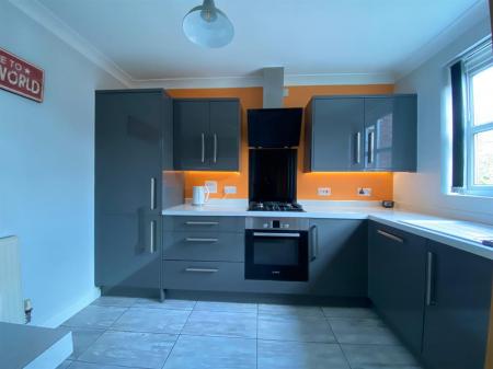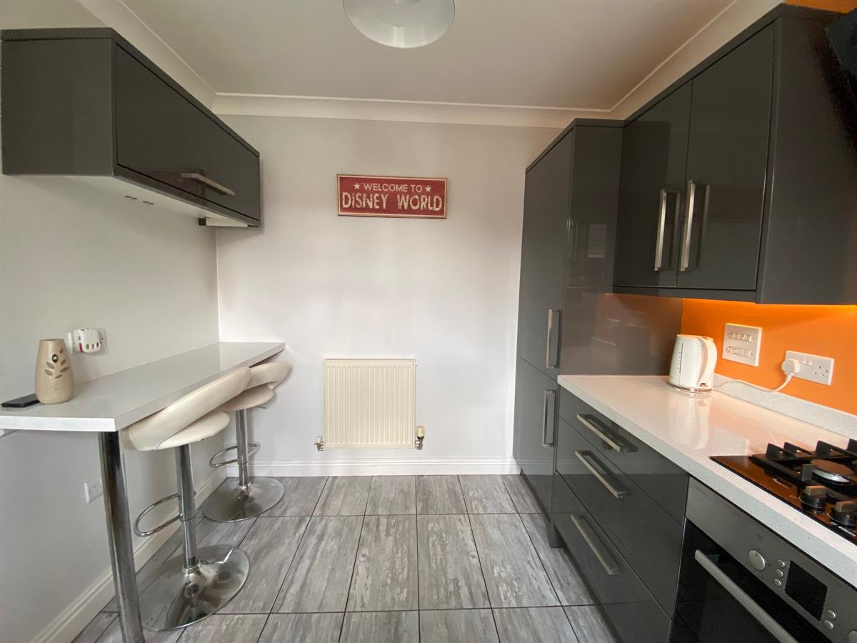 Stylish contemporary kitchen fitted with a range of wall, base and drawer units with quartz effect work surfaces over incorporating a single drainer resin sink unit with mixer tap, built in four ring gas hob, with extractor hood over and electric oven below, integrated dishwasher, space for washer, integrated fridge, integrated freezer, built in breakfast bar, double panelled radiator, tiled flooring, under counter lighting.