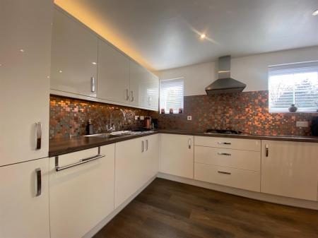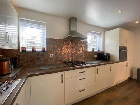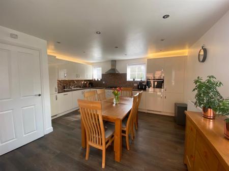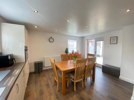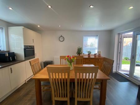 Superb sized dining kitchen / family room, dual aspect having 2 uPvc double glazed windows to the side elevation and a further uPvc double glazed window to the rear elevation and uPvc double glazed French doors leading out onto the rear garden. Laminate flooring continued through from the Reception Hall, double panelled radiator, inset spotlighting. Fitted with a range of wall, base and drawer units with roll top work surfaces over, incorporating a one and a half bowl stainless steel single drainer sink unit with mixer tap and complimentary splash back tiling, built in four ring gas hob with extractor over and a built in eye level electric oven to the side, integrated fridge and integrated freezer, integrated dishwasher, integrated washer, space for dining table and chairs, double panelled radiator.