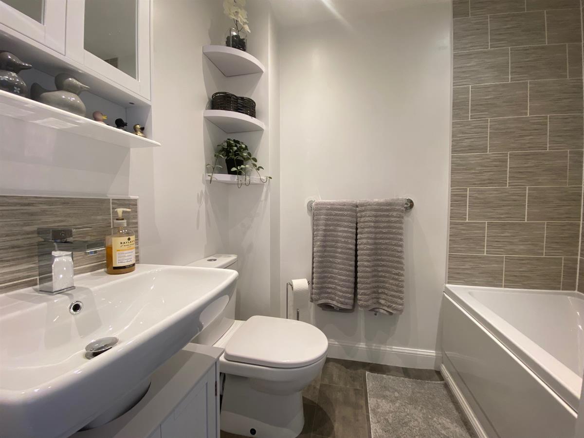 Family bathroom having inset spot lighting, single panelled radiator. Fitted with a three piece suite comprising of a push button low level WC, pedestal wash hand basin with mixer tap and complimentary splash back tiling, panelled bath with glazed shower screen over housing a mixer tap and mixer shower, complimentary wall tiling.