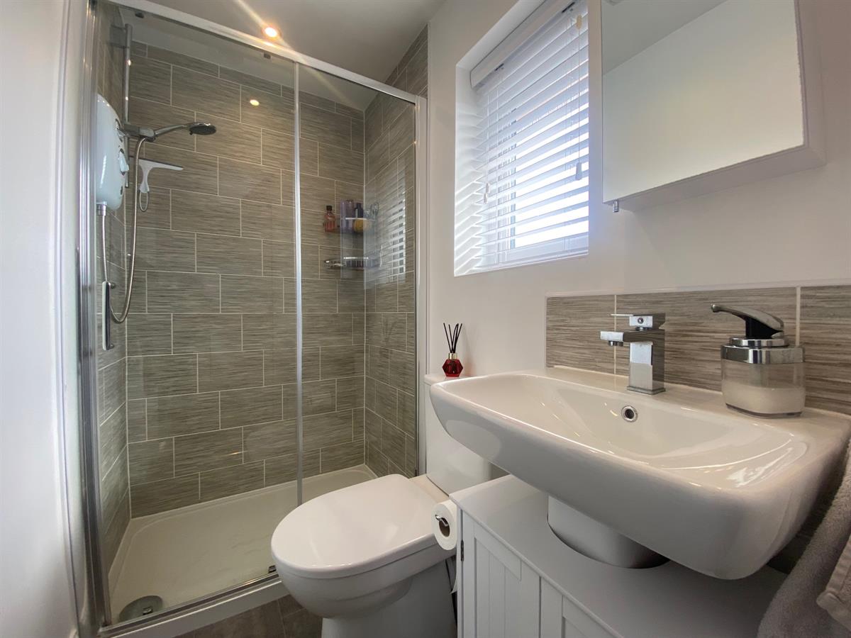 Having a uPvc double glazed frosted panelled window to the side elevation, tile effect flooring, single radiator. Fitted with a three piece suite comprising of a pedestal wash hand basin with mixer tap, push button low level WC, walk in shower cubicle with glazed sliding door housing an electric shower, inset spot lighting, wall mounted shaver socket.