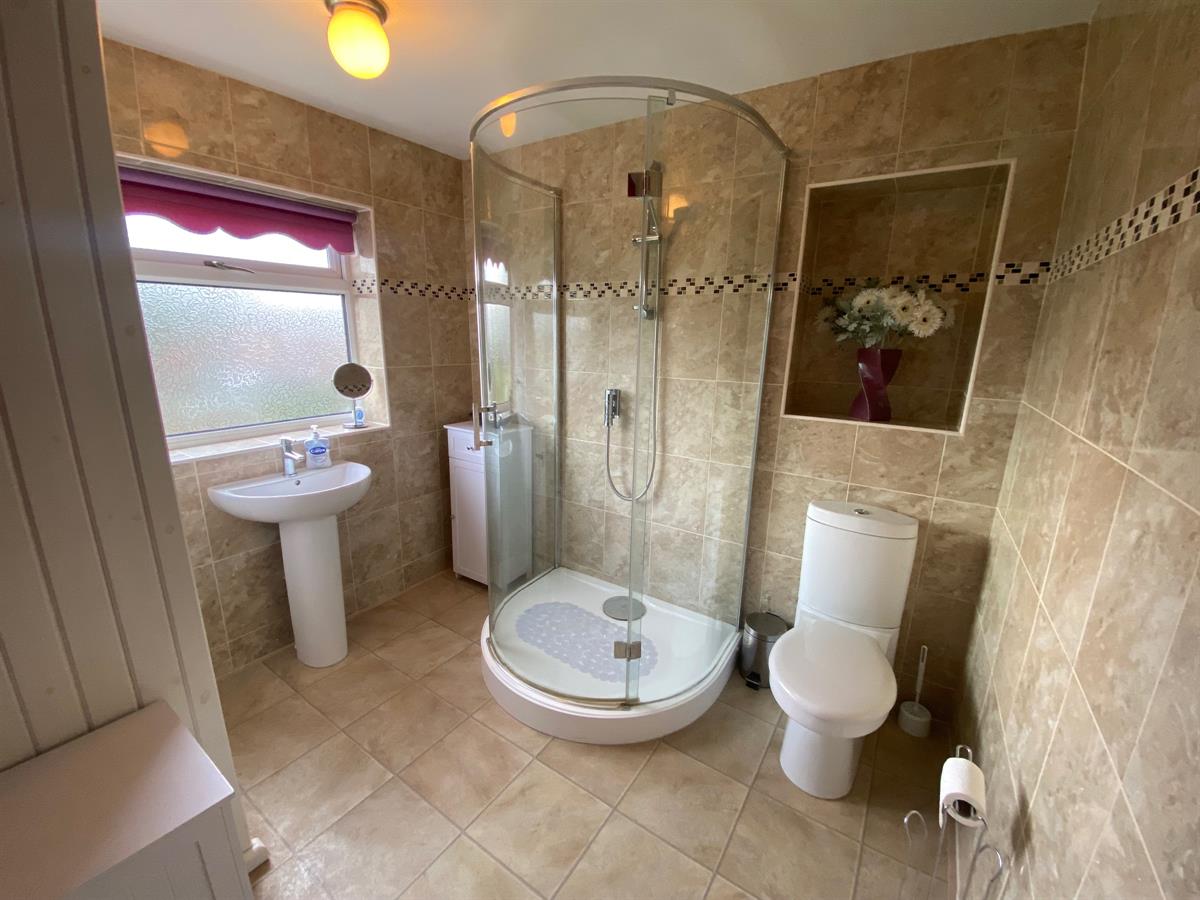 Fitted with a 3 piece suite comprising walk in shower cubicle, low level, push button W.C., pedestal wash hand basin with mixer tap, part tiled walls, radiator, uPvc modesty glazed window to rear elevation, cupboard housing water tank.