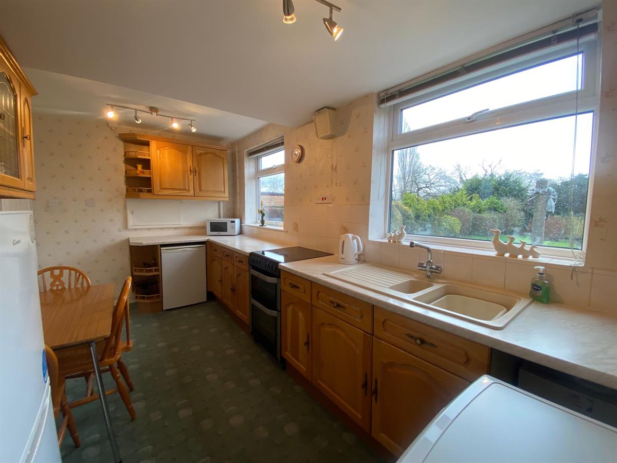 Fitted with a range of wall, base and drawer oak effect units having work surface over incorporating a one and a half bowl resin sink and drainer with mixer tap, uPvc double glazed windows to rear elevation, uPvc panelled door to side elevation, space for under counter fridge, space for fridge/freezer, space and plumbing for washing machine, space for electric cooker, part tiled walls. Radiator.