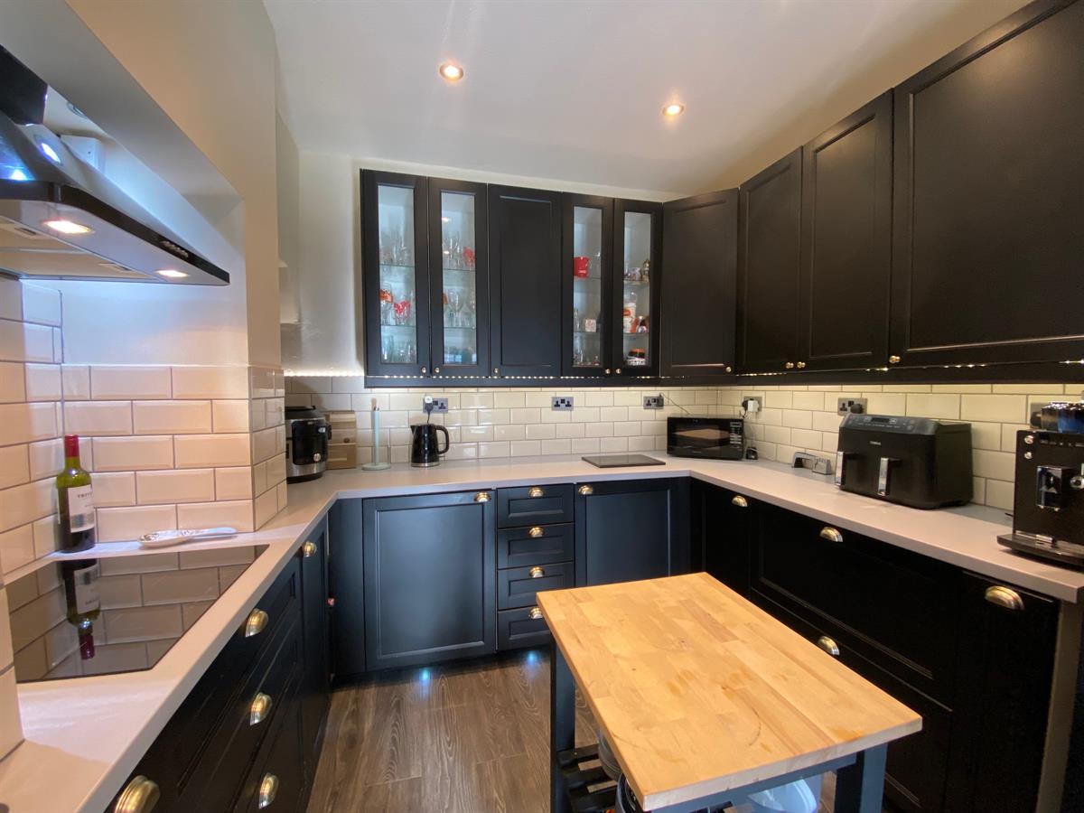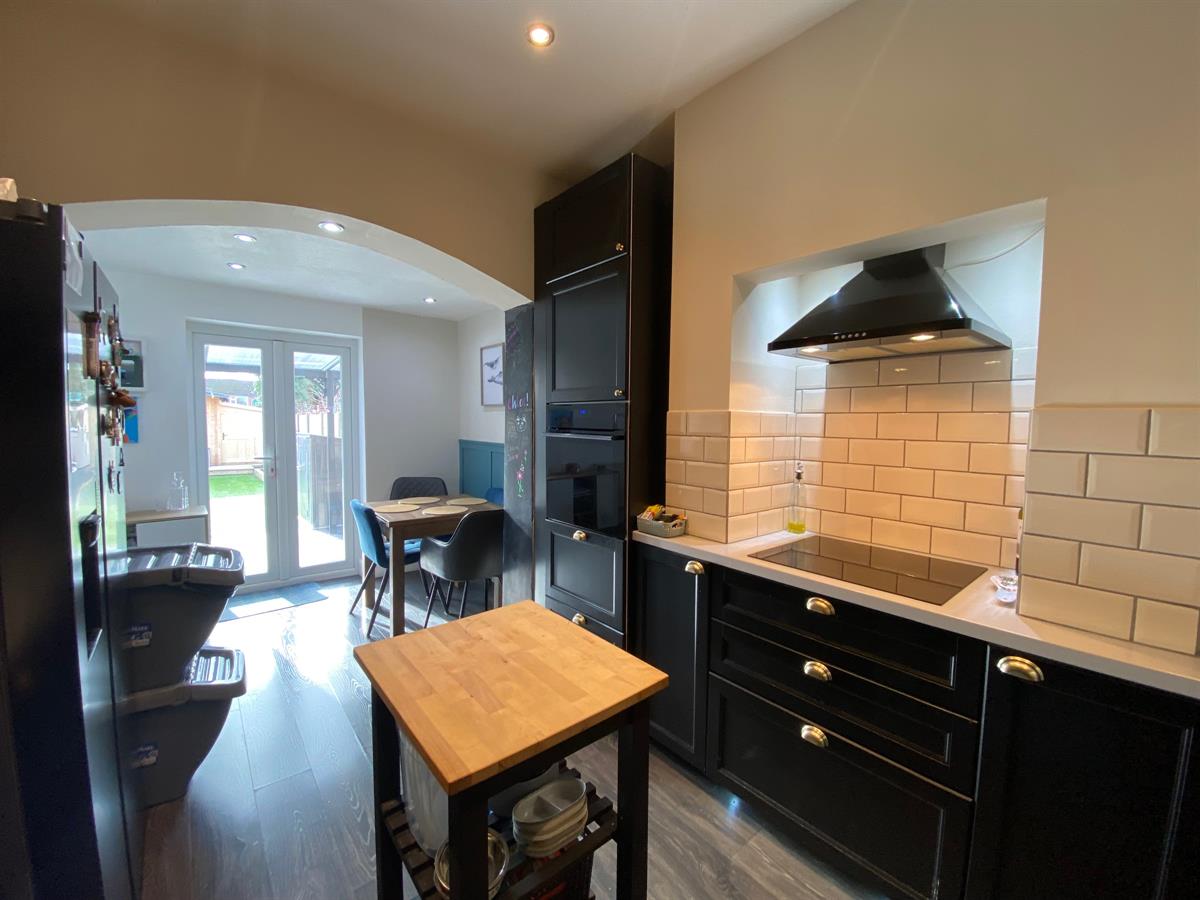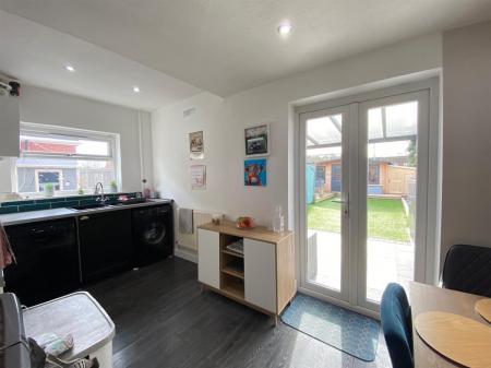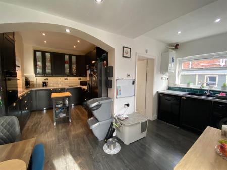 Spacious family kitchen benefitting from uPvc double glazed panelled window to the side elevation, uPvc double glazed panelled doors leading to the rear elevation, laminate flooring throughout, inset spot lighting, single radiator, decorative wall panelling. The kitchen is fitted with a range of wall, base and drawer units with roll top work surfaces over, incorporating a one and a half bowl resin sink unit with mixer tap and complimentary splash back tiling, built in four ring induction hob with extractor hood over, built in eye level electric oven, space for American style fridge freezer, under counter lighting, space for table and chairs, space for washer, space for dishwasher.
