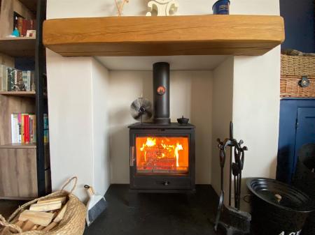 Spacious living room with uPvc double glazed panelled walk in bay window to the front elevation, double panelled radiator, oak effect laminate flooring continued through from the reception hall, recessed fire place housing a multi fuel burner with wooden mantle over, decorative double glazed panelled arched feature window to the side elevation.