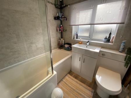 Modern family bathroom with uPvc double glazed frosted panelled window to the rear elevation, laminate flooring, heated ladder style towel rail, three piece suite comprising of a push button low level WC with concealed cistern, vanity unit wash hand basin with mixer tap and storage cupboards below, P-Shaped panelled bath with mixer tap and mixer shower over with a rainfall shower head and additional hand held shower attachment and glazed shower screen, inset spot lighting, complimentary wall tiling.
