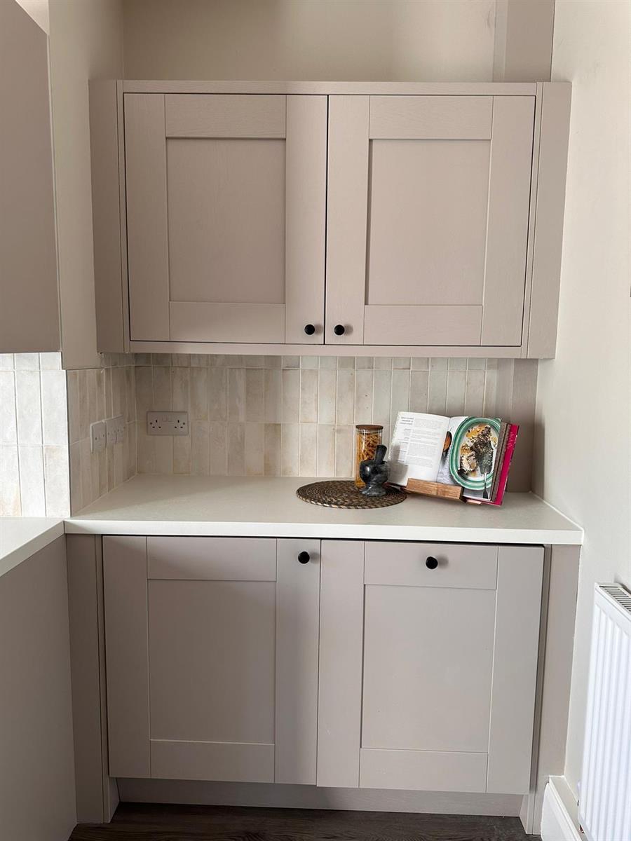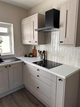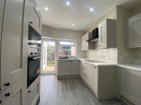 A beautiful modern kitchen having a uPvc double glazed panelled window to the rear elevation, uPvc double glazed panelled door leading out to the rear garden, laminate flooring. The kitchen is fitted with a range of wall, base and drawer units with work surfaces over incorporating a one and a half bowl resin sink unit with mixer tap and complimentary splash back tiling, built in four ring electric hob with extractor hood over and built in eye level electric oven and integrated microwave above, integrated fridge, integrated freezer, integrated dishwasher, inset spot lighting, double panelled radiator.