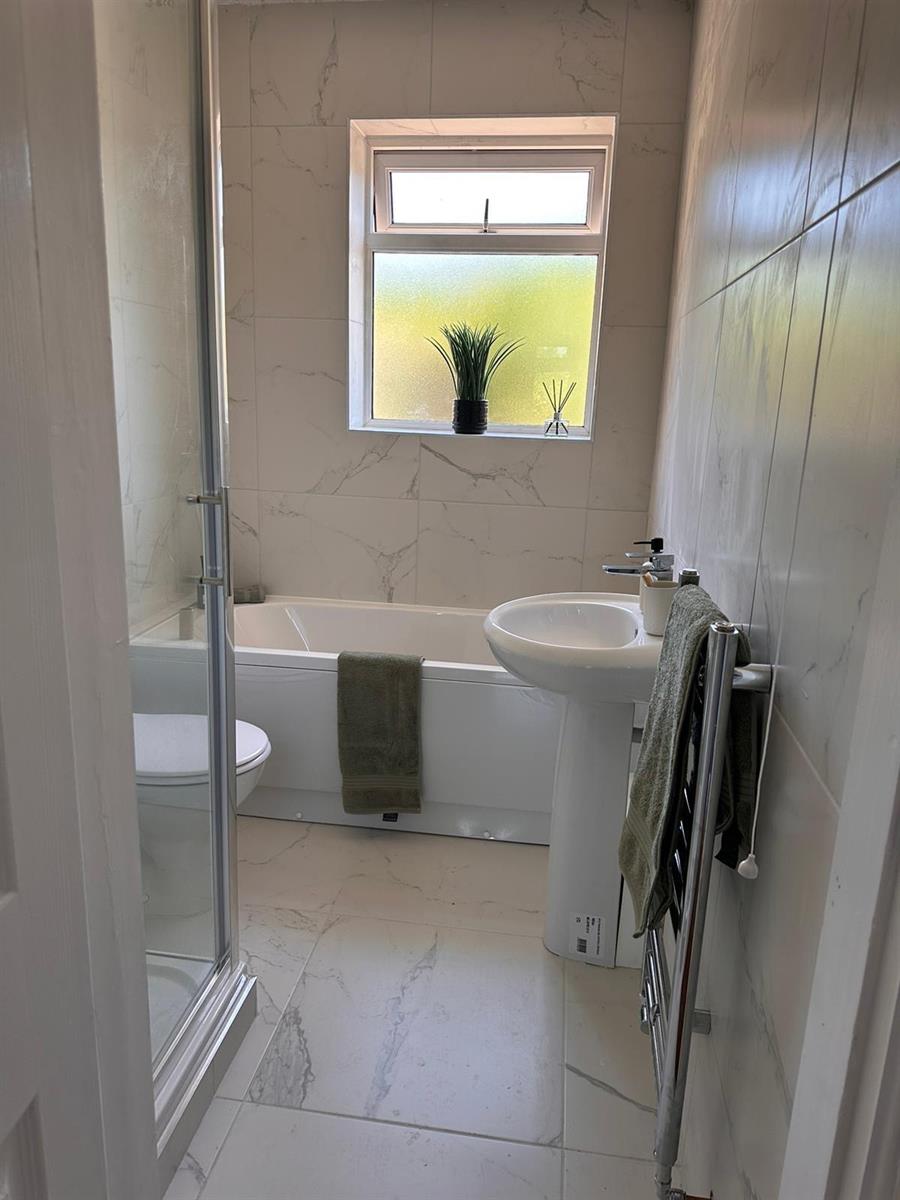 Having a four piece suite comprising of a pedestal wash hand basin with mixer tap, push button low level WC, panelled bath with mixer tap, walk in shower cubicle with glazed pivot door housing a mixer shower with rain fall shower head and an additional hand held shower attachment, inset spot lighting, complimentary wall and floor tiling, heated towel rail finished in chrome, loft access point, uPvc double glazed frosted panelled window to the rear elevation.